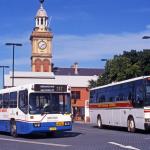 Download: STA Mercedes 0305 MK V 3378, Port Stephens MCA, Cummins 763, Great Lakes Coach MO-4409, terminus, Newcastle Railway Station, NSW, 4 September 1999