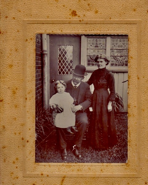 2. Herbert and Ella Porter with their daughter Ella in front of their new house in about 1913: with mat surround