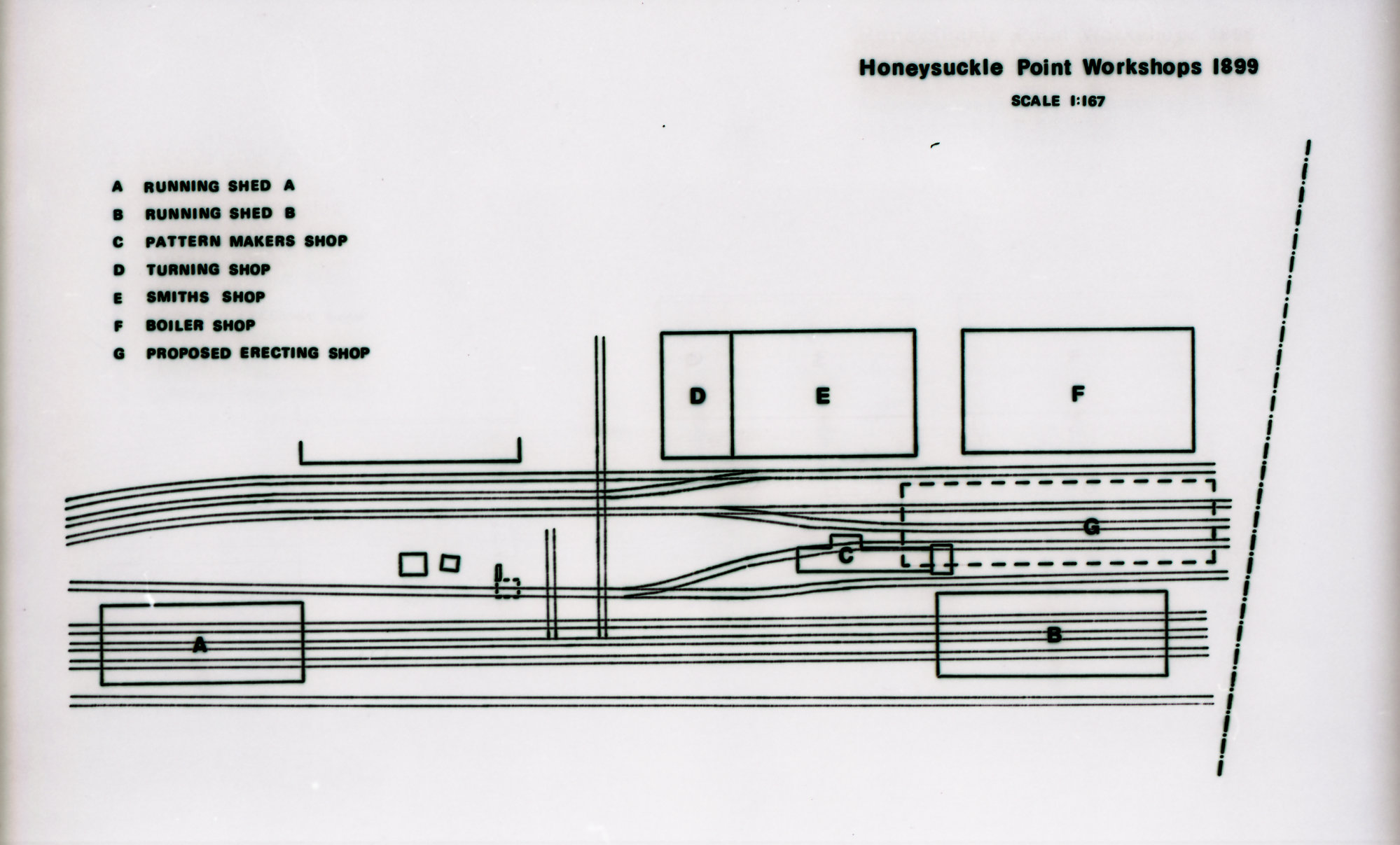 Bairstow, Damaris, Honeysuckle Point Railway Workshops - 1899, State Railway Archives, redrawn D Bairstow, 1979 (1979 (redrawn)), [C919-0503]. Living Histories, accessed 16/02/2026, https://livinghistories.newcastle.edu.au/nodes/view/101351