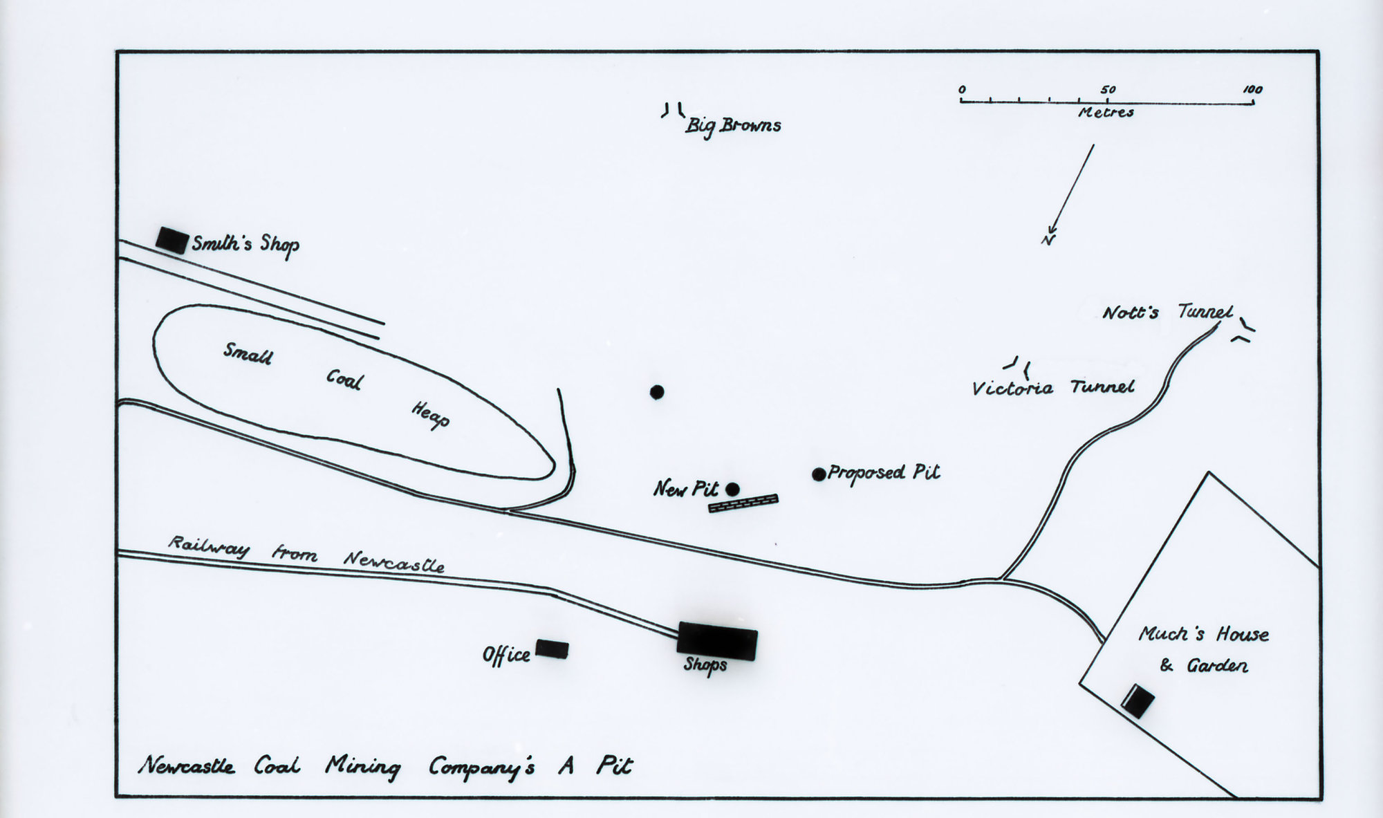 Bairstow, Damaris, A Pit, Newcastle Coal Mining Company, map, from Newcastle City Library AM A15/1, redrawn by D Bairstow, 1980 (1980), [C919-1372]. Living Histories, accessed 22/01/2026, https://livinghistories.newcastle.edu.au/nodes/view/104039
