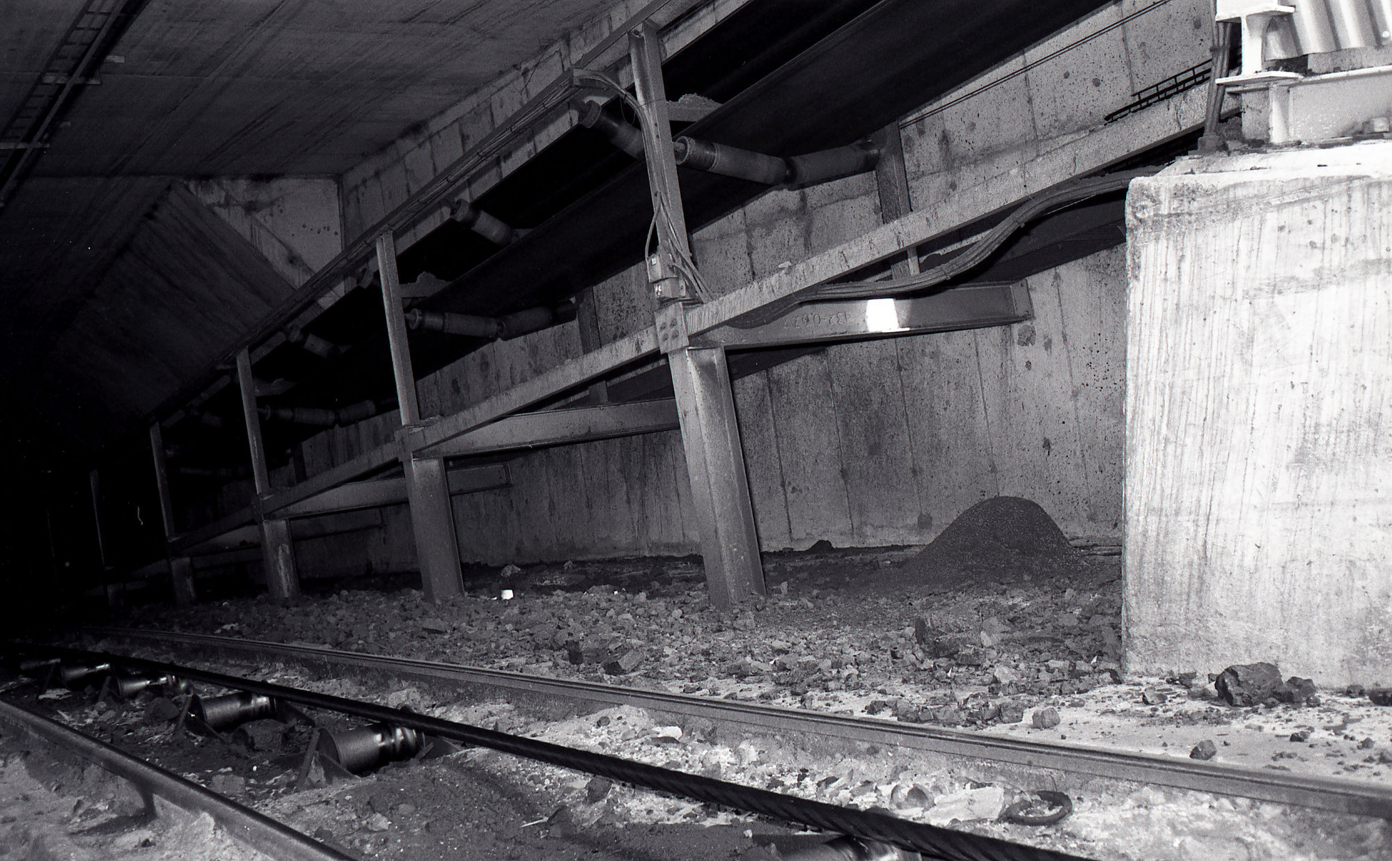 Tunnel entrance, haulage rope and conveyor, Ellalong Colliery, Paxton, NSW, 30 April 1980