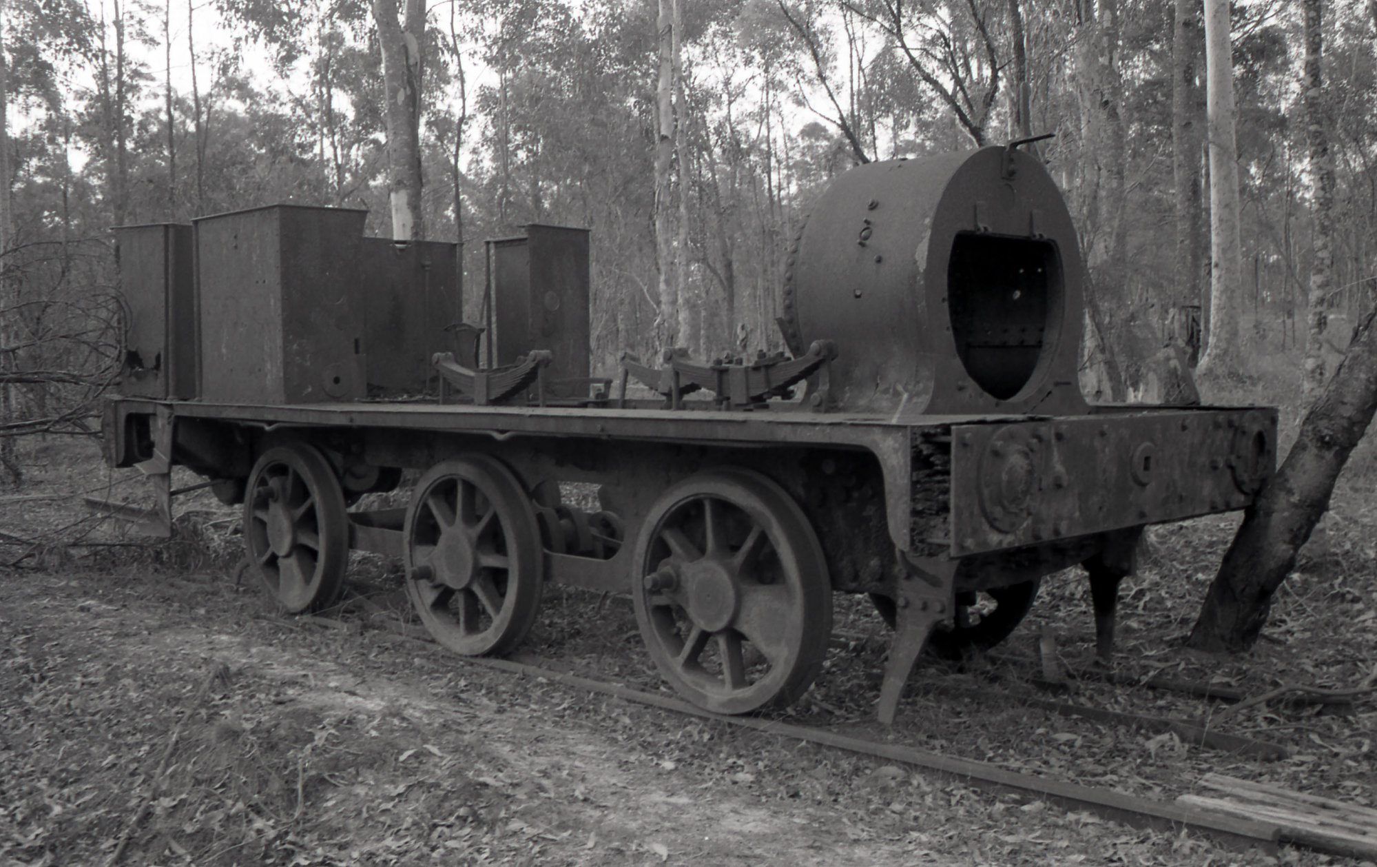 Remains, 1879 saddle-back locomotive used at Kalingo Colliery until 1930, Bellbird Heights, NSW, 24 May 1980