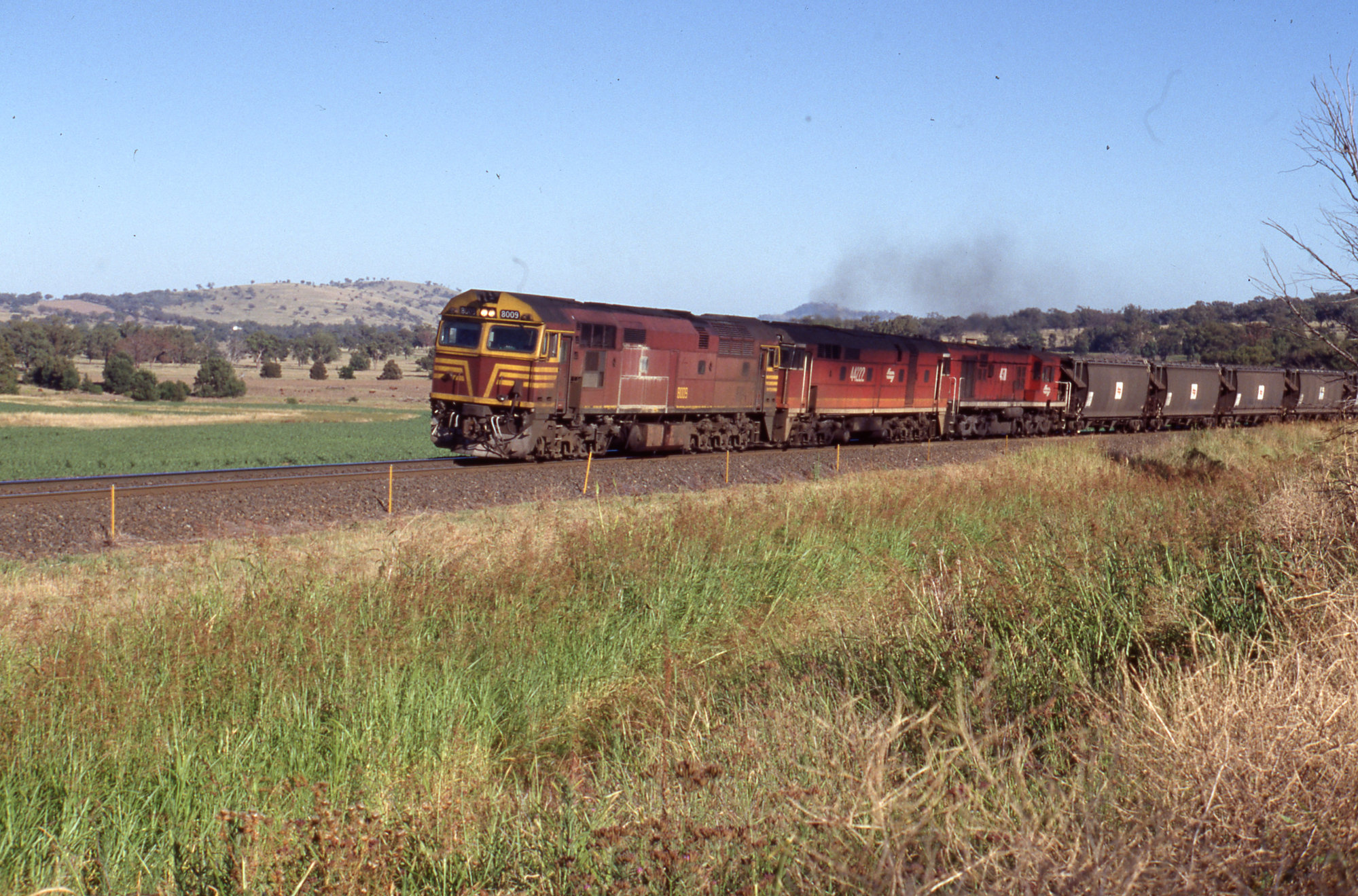 8009, 44222 and 4511, wheat train, Chilcotts Creek, NSW, 25 January 1989