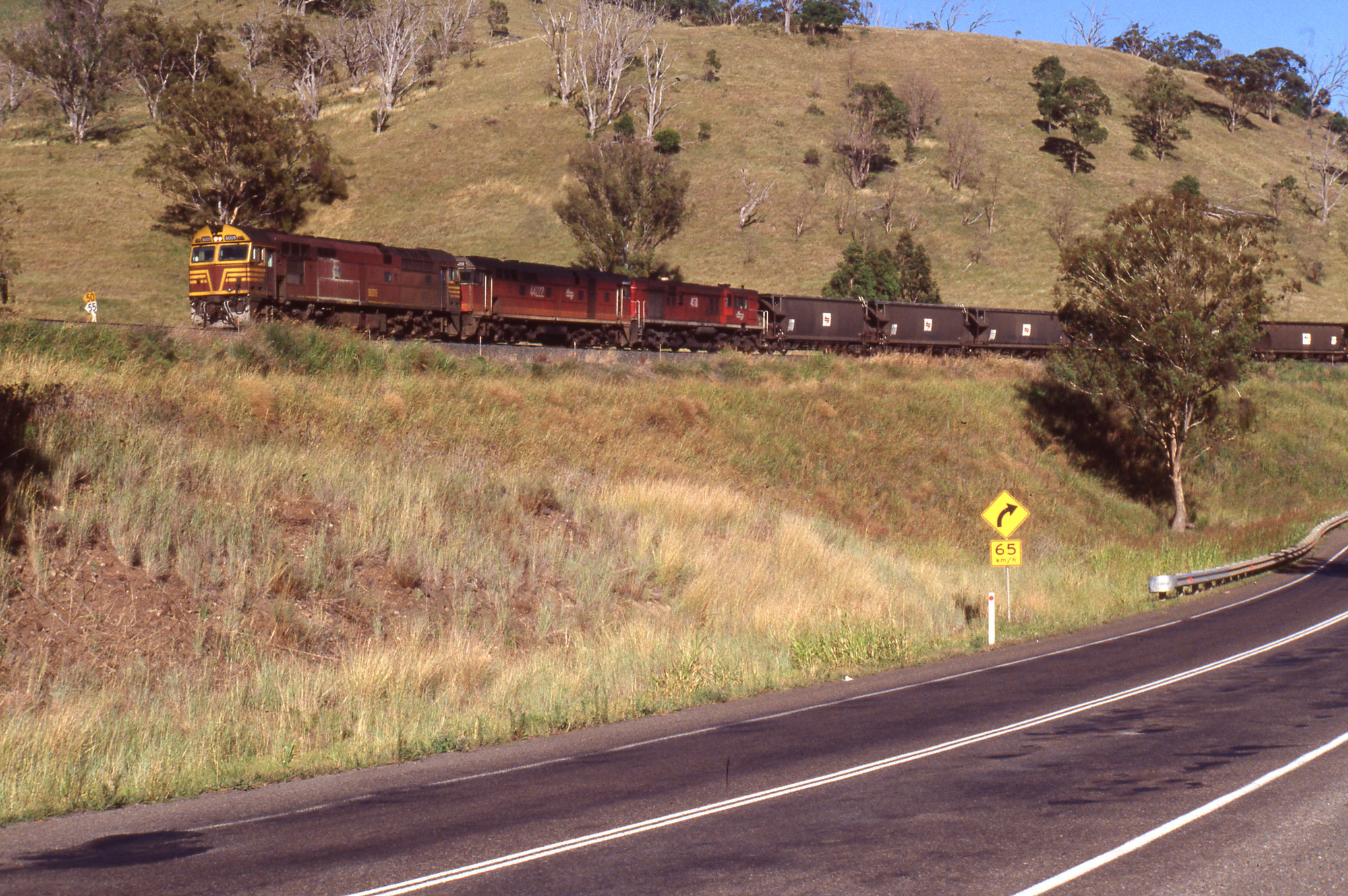 8009, 44222 and 4511, wheat train, Kankool, NSW, 25 January 1989