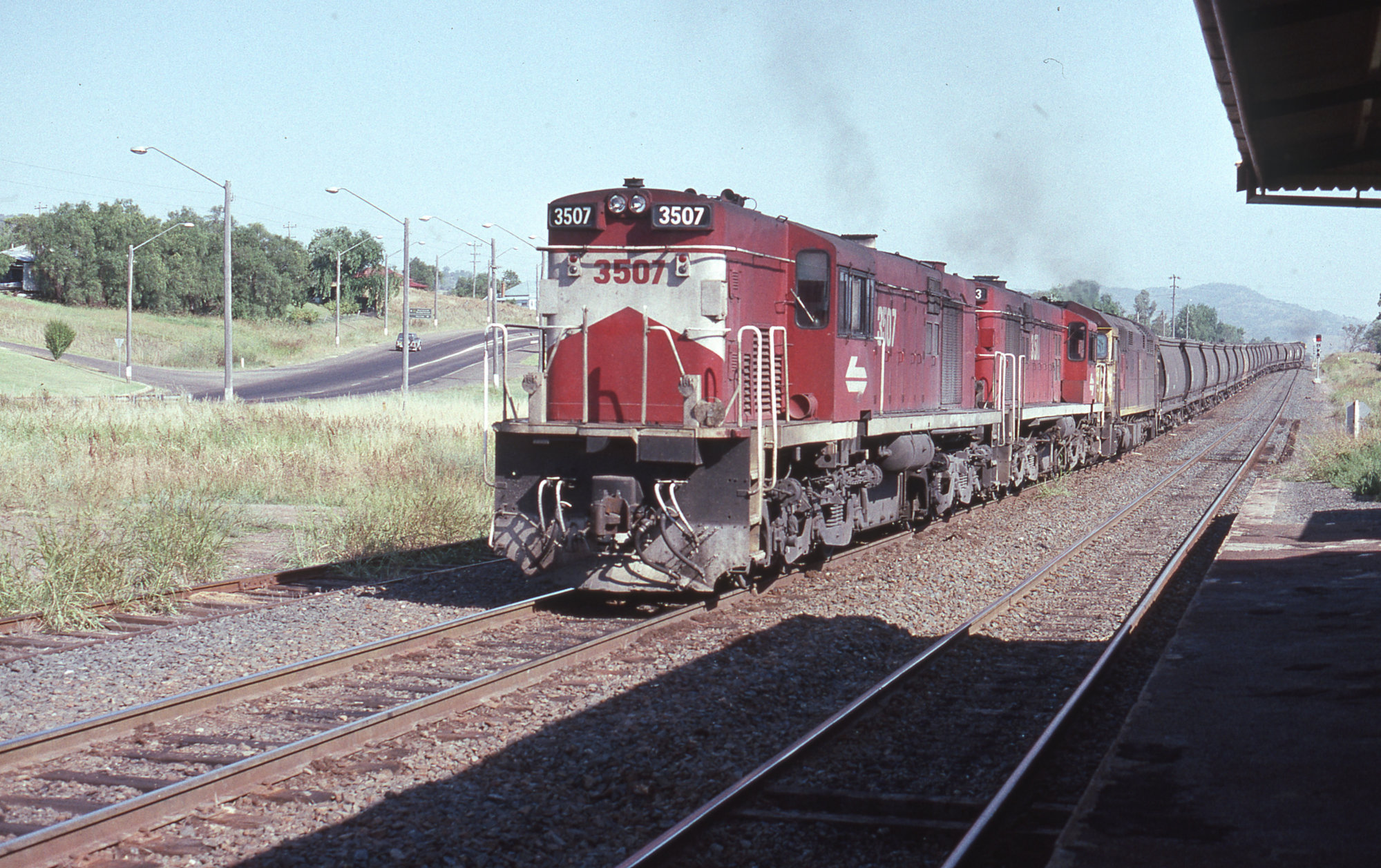 Astle, Anthony R, (1934 -), 3507, 3513 and 8045, banking wheat train, Willow Tree, NSW, 4 January 1990 (4th January 1990), [ARA RND 227]. Living Histories, accessed 14/04/2026, https://livinghistories.newcastle.edu.au/nodes/view/105216