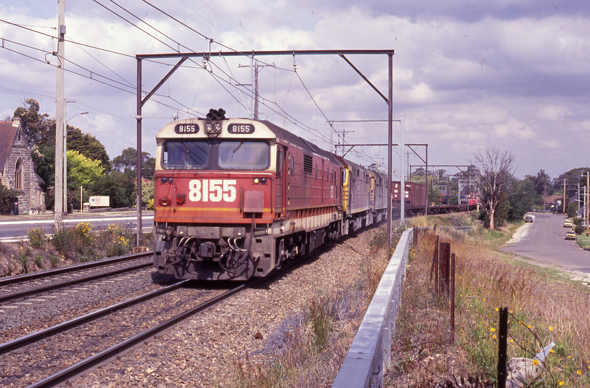 8155 and two 80 Class, express freight, Springwood, NSW, 12 July 1991