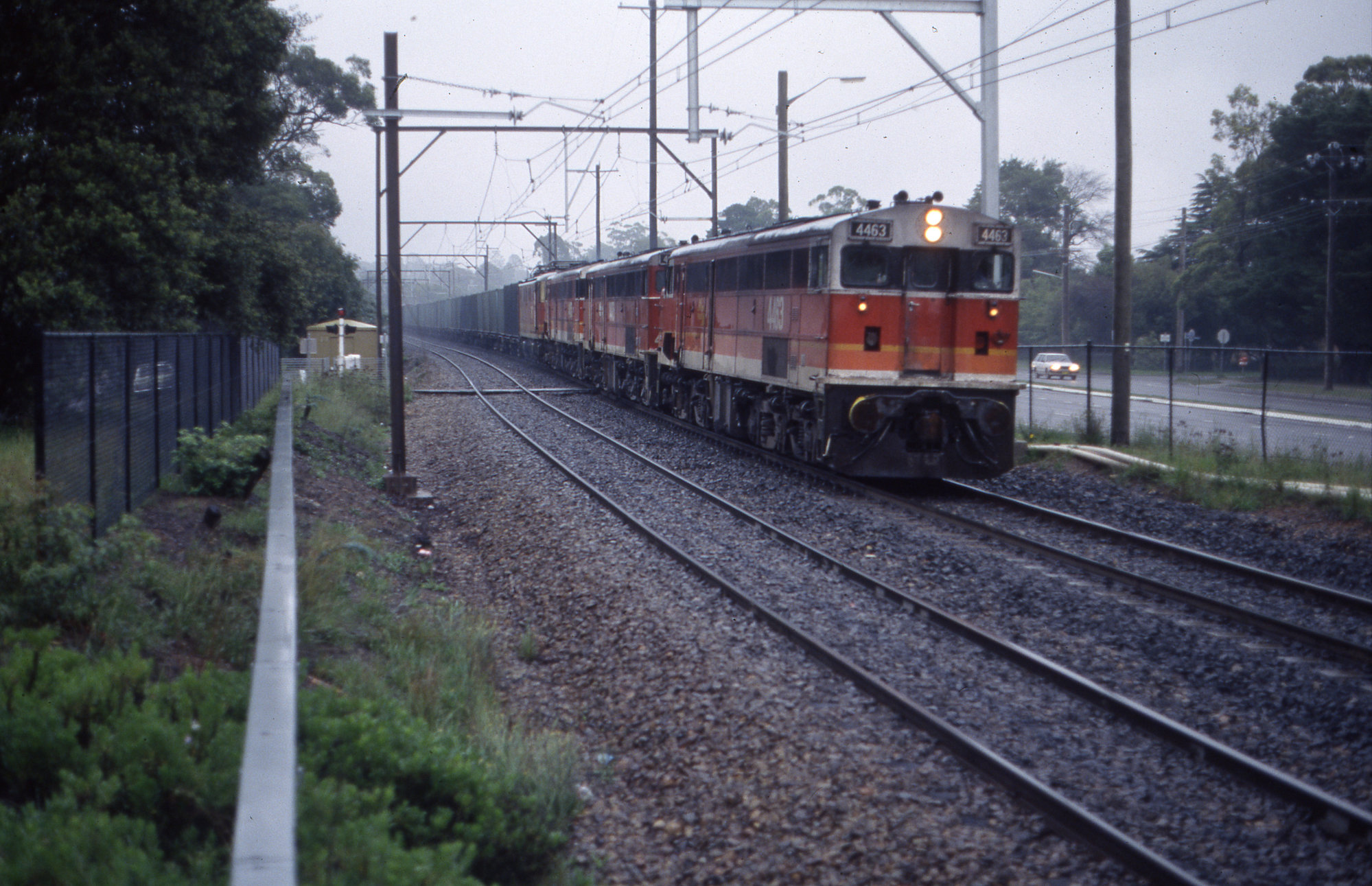 4463, 4475, 44 Class and 4607, container train, Springwood, NSW, 7 February 1992