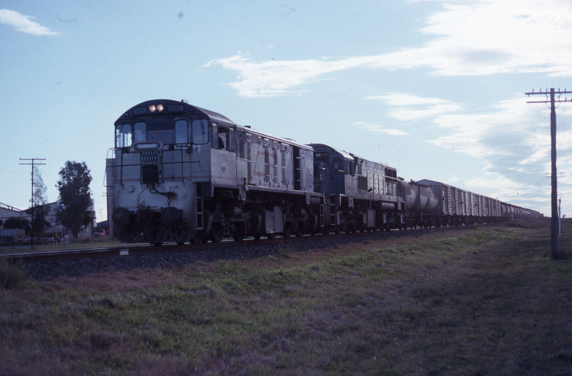 Astle, Anthony R, (1934 -), 1704 and 2150, goods train, Dalby, Qld, 4 July 1989 (4th July 1989), [ARA RQU 042]. Living Histories, accessed 29/04/2026, https://livinghistories.newcastle.edu.au/nodes/view/105640