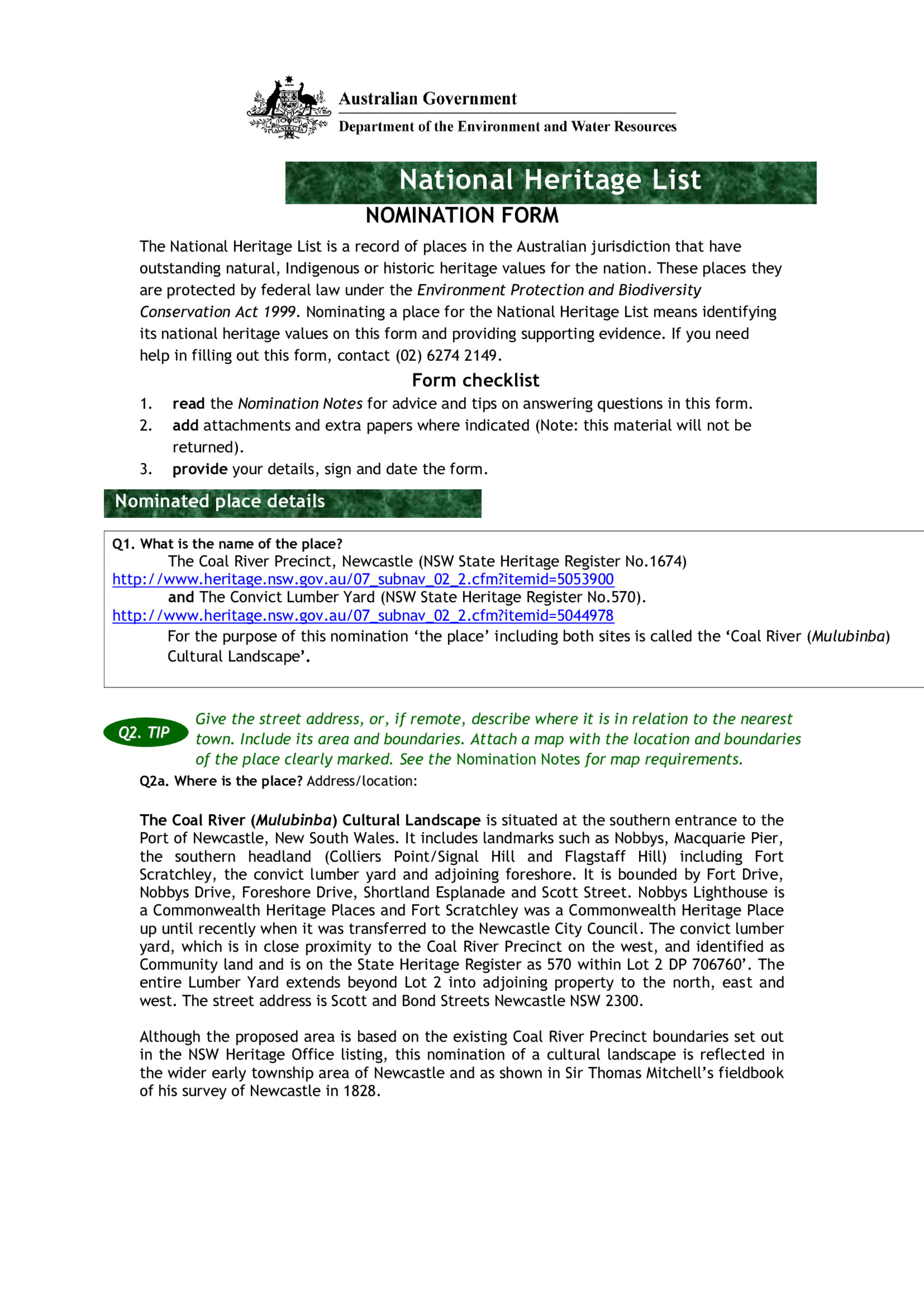 Nomination for the Coal River (Mulubinba) Cultural Landscape to be added to the National Heritage List