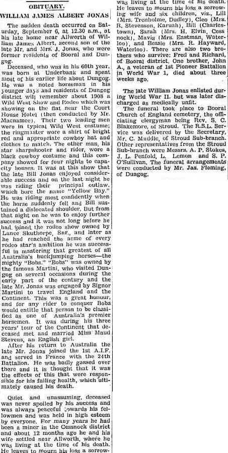 Dungog Chronicle : Durham and Gloucester Advertiser, Obituary : William James Albert Jonas (12th September 1947). Living Histories, accessed 12/04/2026, https://livinghistories.newcastle.edu.au/nodes/view/106335