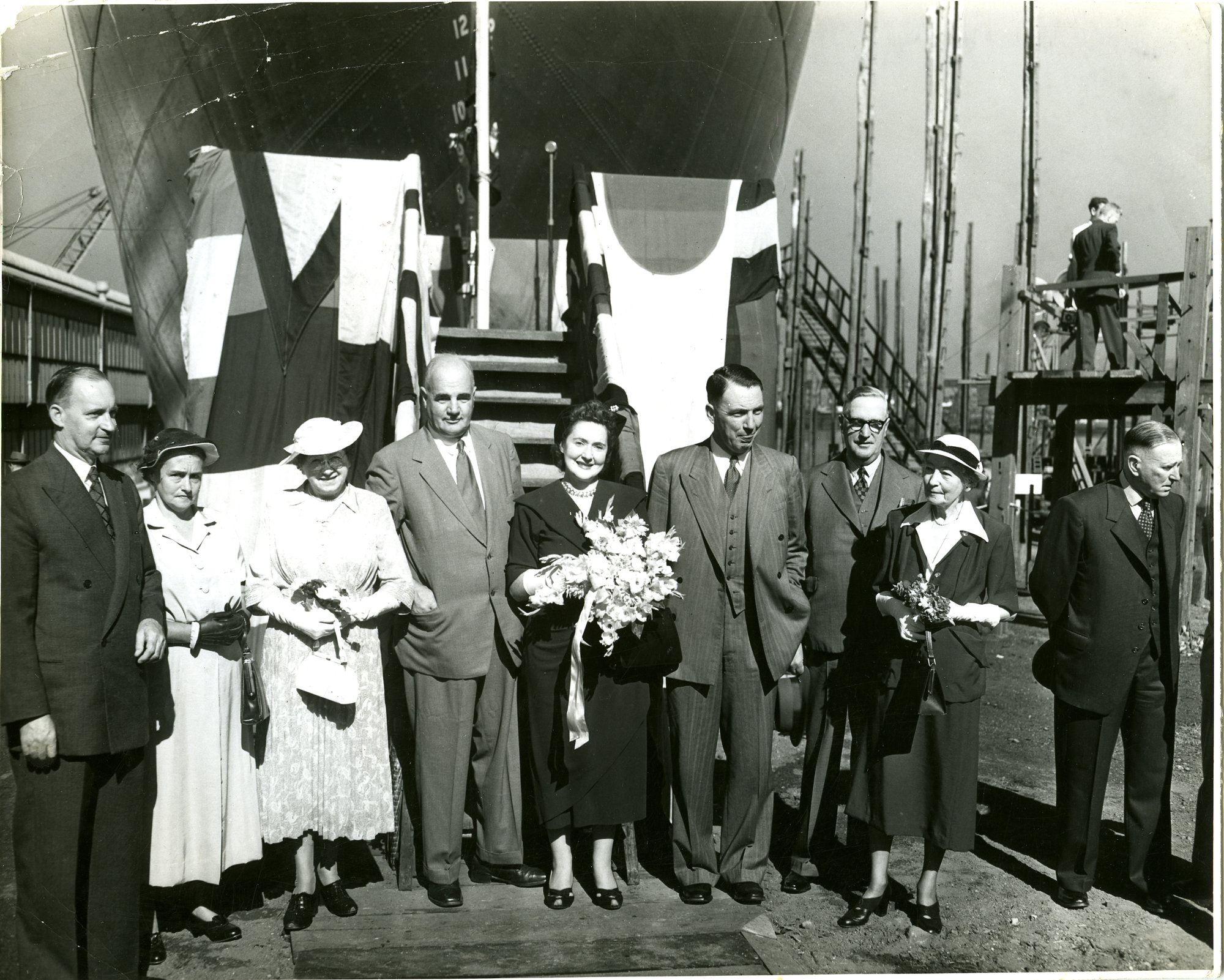 Mr D. L. McLarty (fourth from the left) with unidentified people standing in front of a ship - State Dockyard, Newcastle, NSW, [n.d.], [A6678-ii-b-014]. Living Histories, accessed 14/04/2026, https://livinghistories.newcastle.edu.au/nodes/view/10699