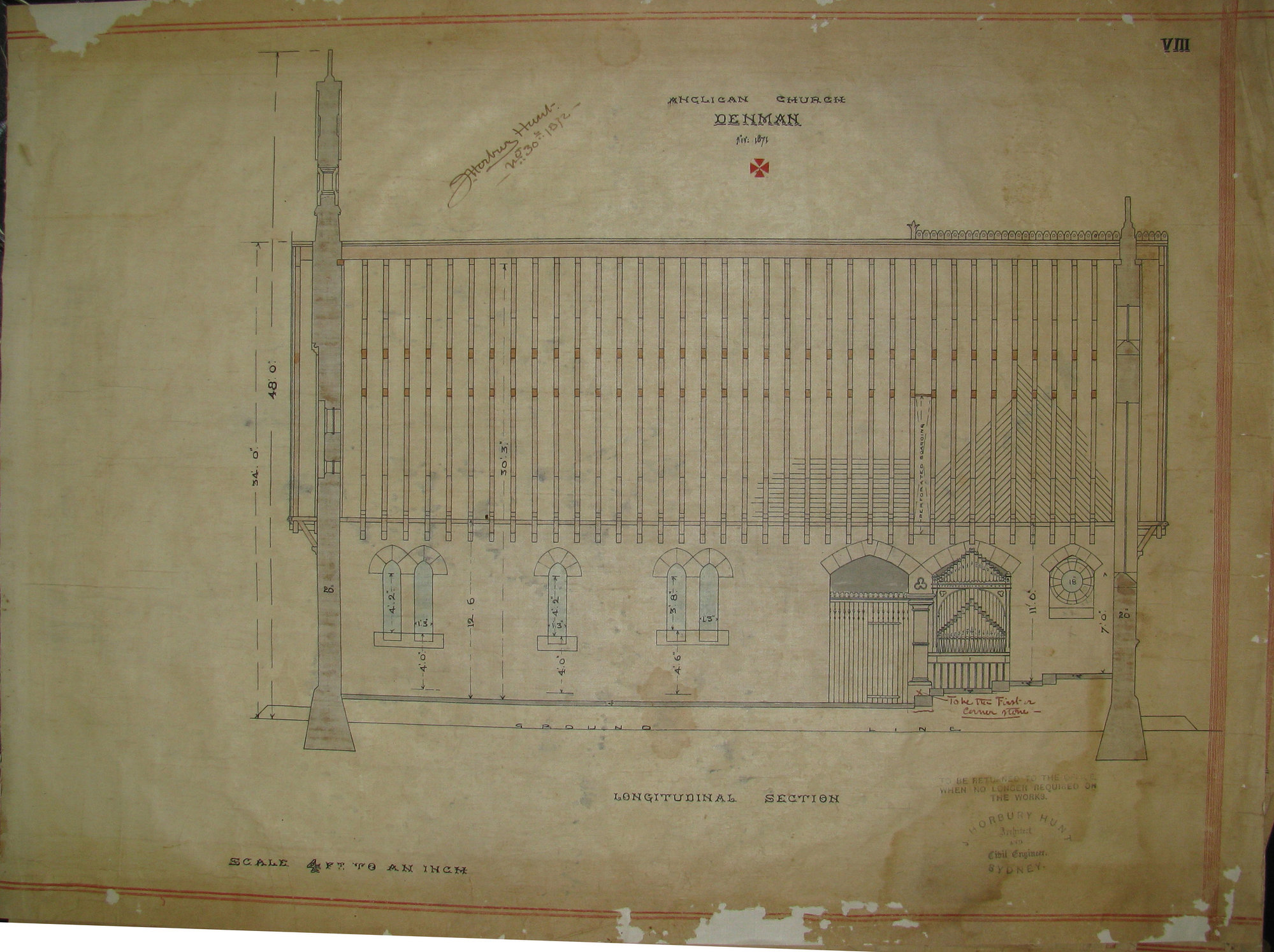 Hunt, John Horbury, 1838-1904, Anglican Church, Denman, longitudinal section, November 1871, architectural drawing (November 1871), [M2181]. Living Histories, accessed 14/04/2026, https://livinghistories.newcastle.edu.au/nodes/view/108082