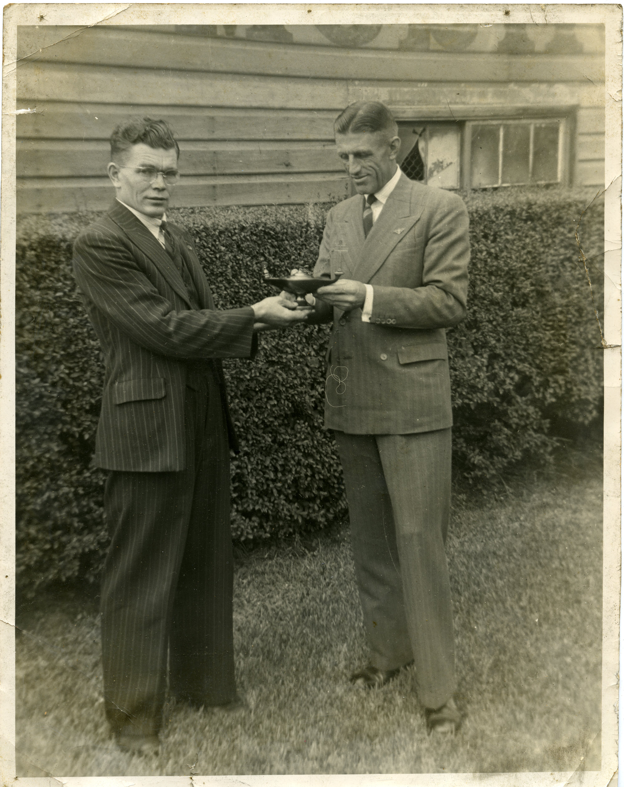 Two gentlemen holding the TOC H Lamp of Maintenance., [A5189_011]. Living Histories, accessed 25/03/2026, https://livinghistories.newcastle.edu.au/nodes/view/108151