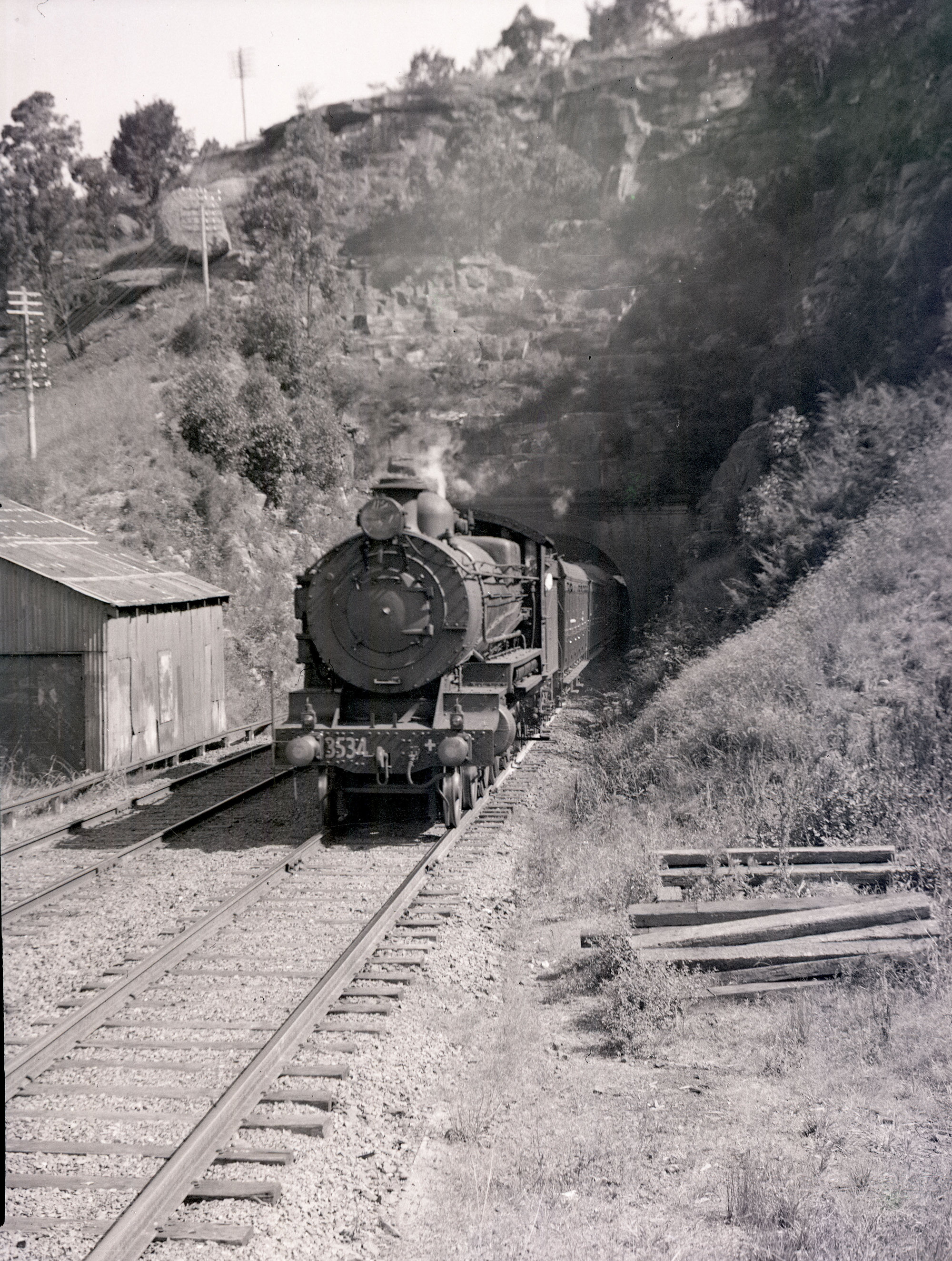 NSWGR C35 Class, 4-6-0 Type, No. 3534, still in original condition exiting Long Island Tunnel onto the Old Hawkesbury River Bridge, [1930s] ([1930s]), [ARHSBox008_0202]. Living Histories, accessed 19/03/2026, https://livinghistories.newcastle.edu.au/nodes/view/10820