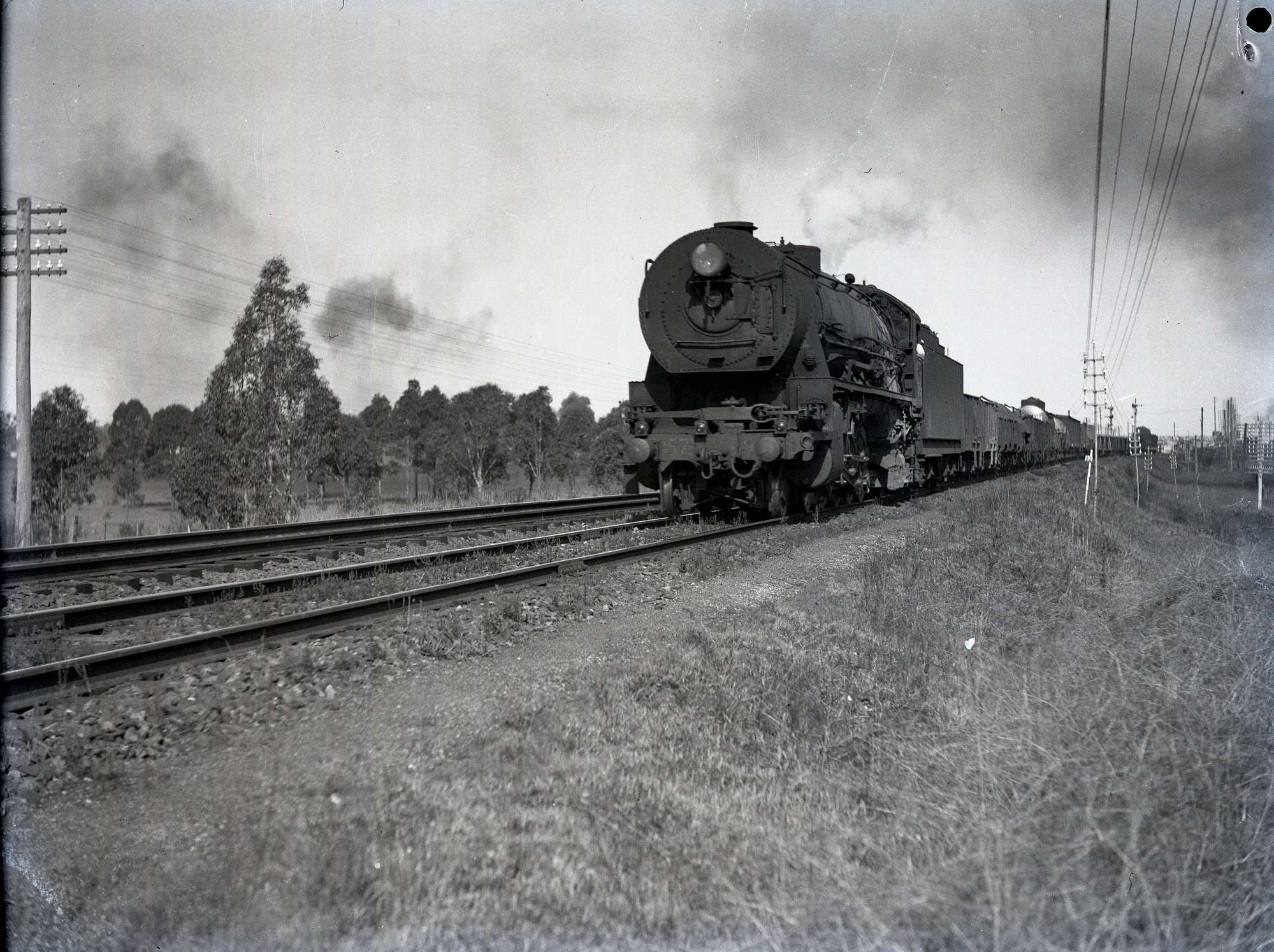 NSWGR D57 Class, No. 5719, Mountain Type, heavy goods locomotive on goods train near Ingleburn, [1930s]