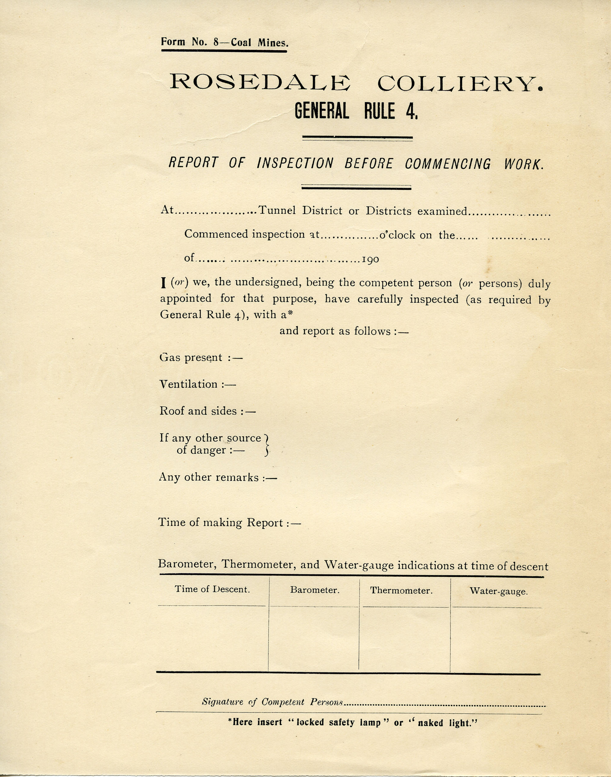 Rosedale Colliery Report of Inspection before Commencing Work - form
