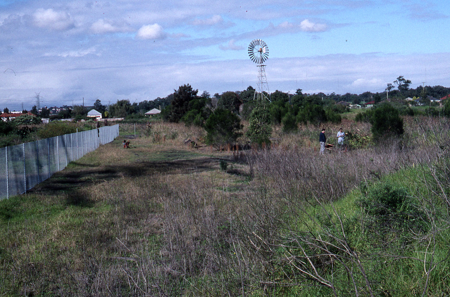 Patrick Lightfoot, Planting behind windmill, working bee, Hunter Wetlands, Shortland, NSW, May 1997 (May 1997), [HWB3_0108]. Living Histories, accessed 01/05/2026, https://livinghistories.newcastle.edu.au/nodes/view/109816