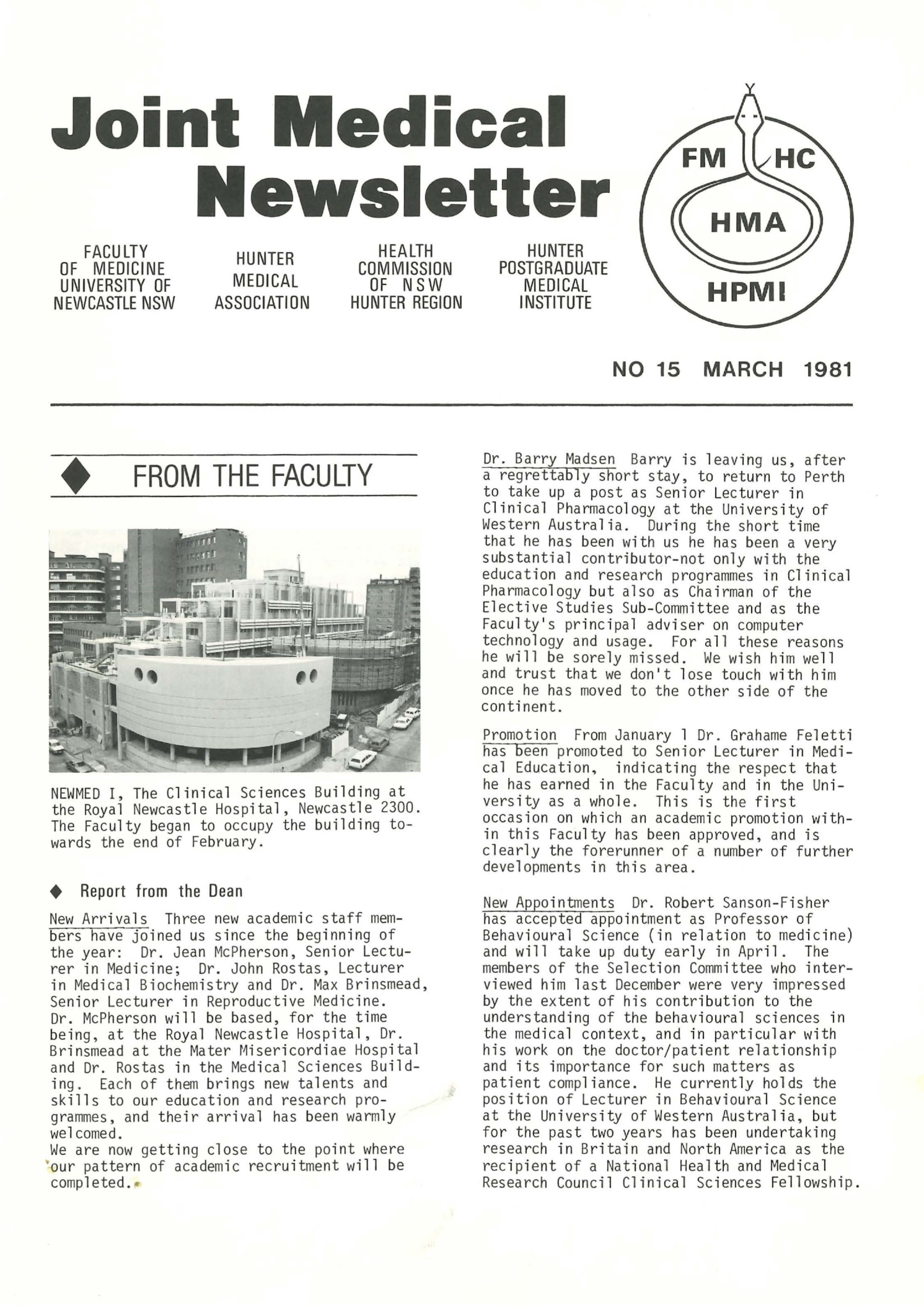 University of Newcastle. Faculty of Medicine, Joint Medical Newsletter No. 015, March 1981, [Joint_Medical_Newsletter_No_015_March_1981]. Living Histories, accessed 30/04/2026, https://livinghistories.newcastle.edu.au/nodes/view/109995