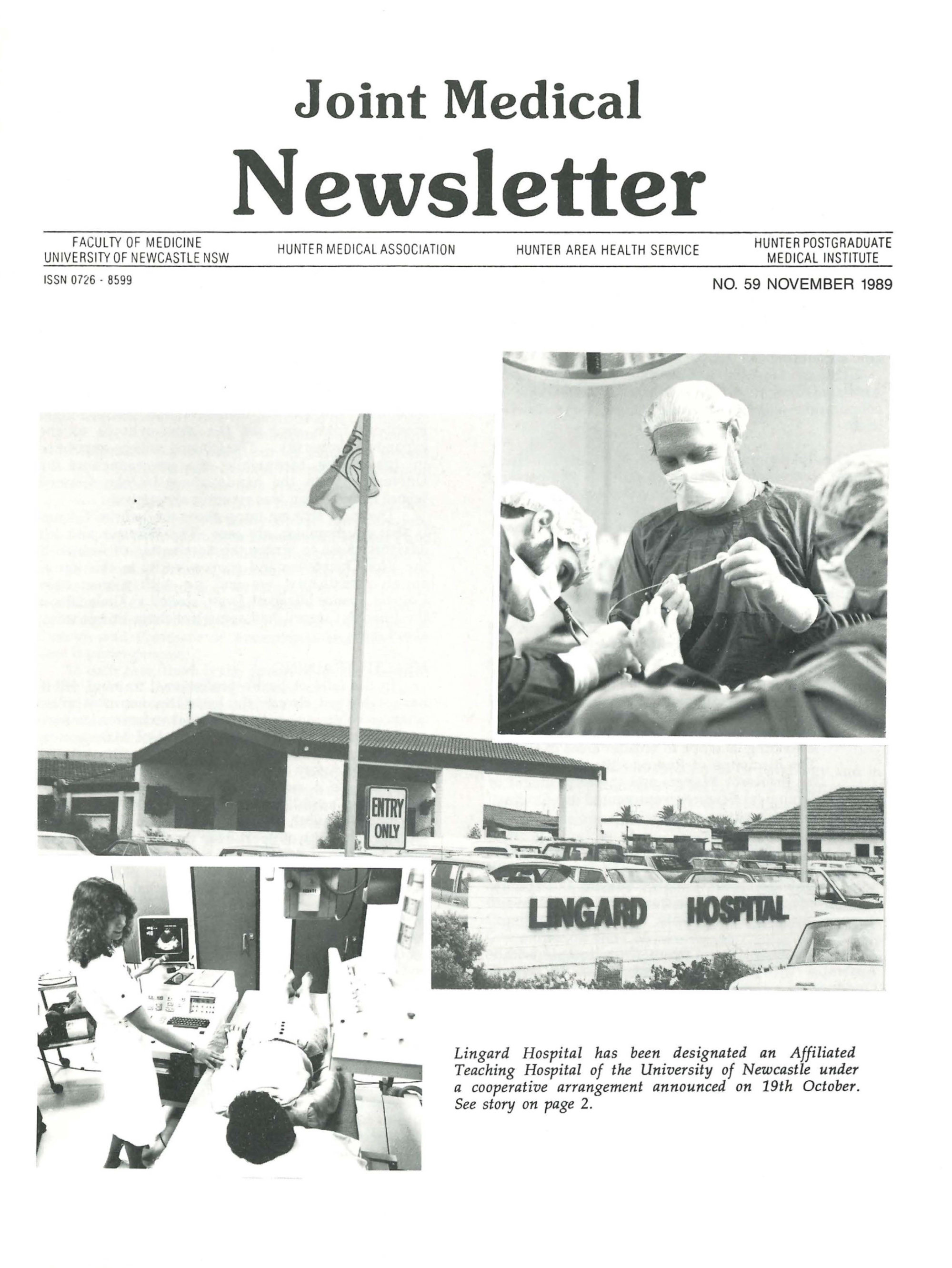 University of Newcastle. Faculty of Medicine, Joint Medical Newsletter No. 059, November 1989, [Joint_Medical_Newsletter_No_059_November_1989]. Living Histories, accessed 17/04/2026, https://livinghistories.newcastle.edu.au/nodes/view/110039