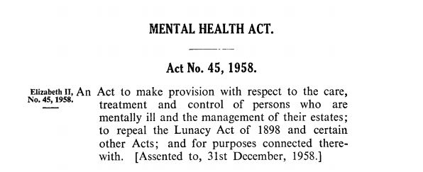 NSW Government, Mental Health Act, Act No 45, 1958 (1958). Living Histories, accessed 05/04/2026, https://livinghistories.newcastle.edu.au/nodes/view/110158