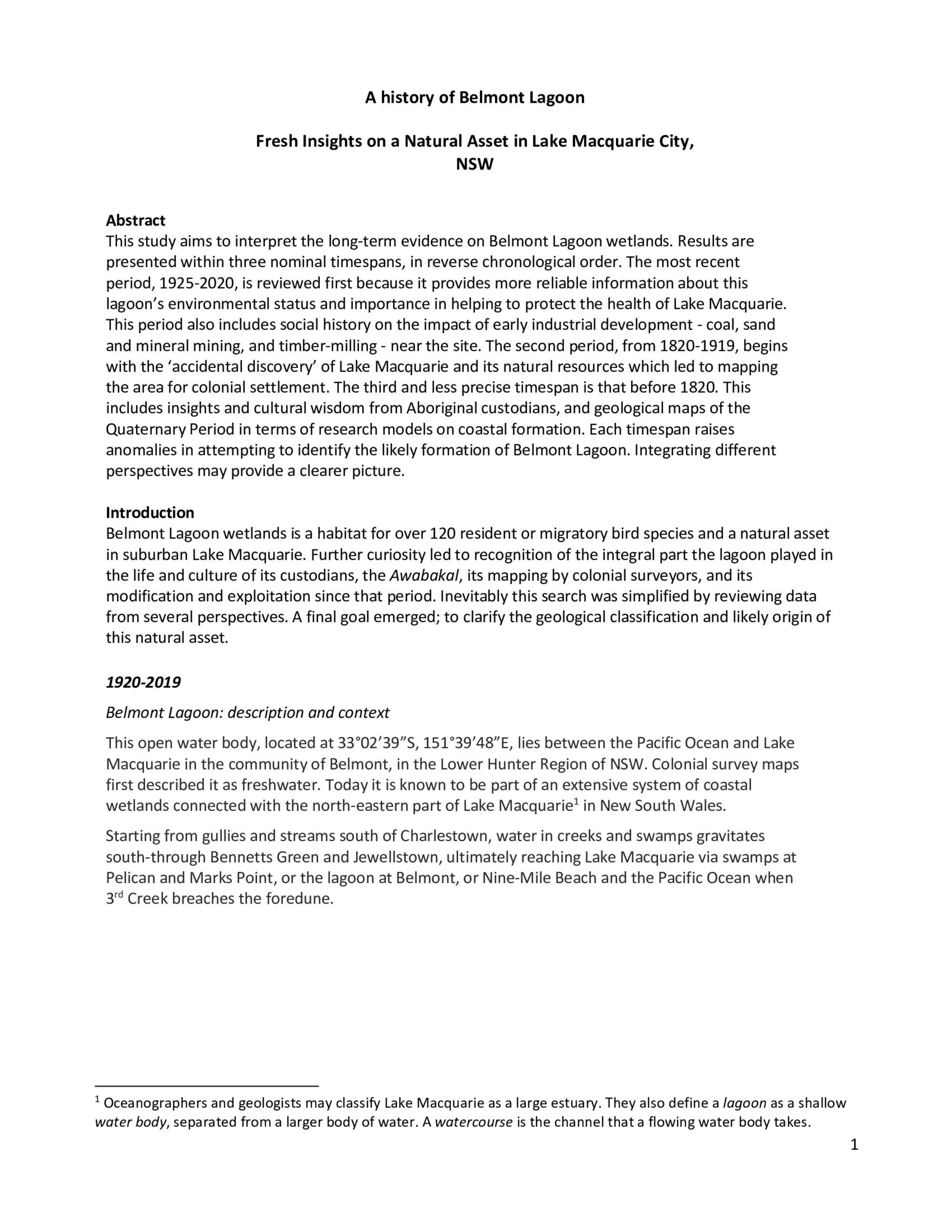 History of Belmont Lagoon - Fresh Insights on a Natural Asset in Lake Macquarie