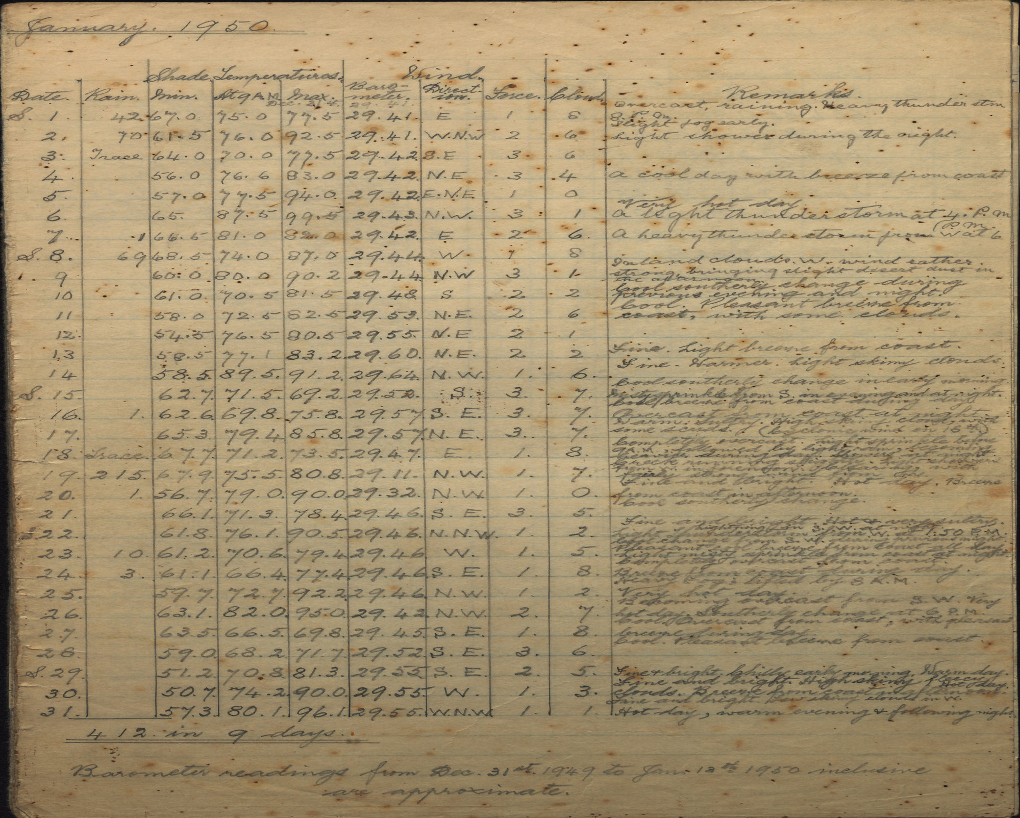 Wyndham Family, Meteorological Observations at Wollong, Mount Vincent. 1950-1956 (Between 1st January 1950 and 30th September 1956), [Box 1 Item 5 - Part 3 of 3]. Living Histories, accessed 08/04/2026, https://livinghistories.newcastle.edu.au/nodes/view/110407