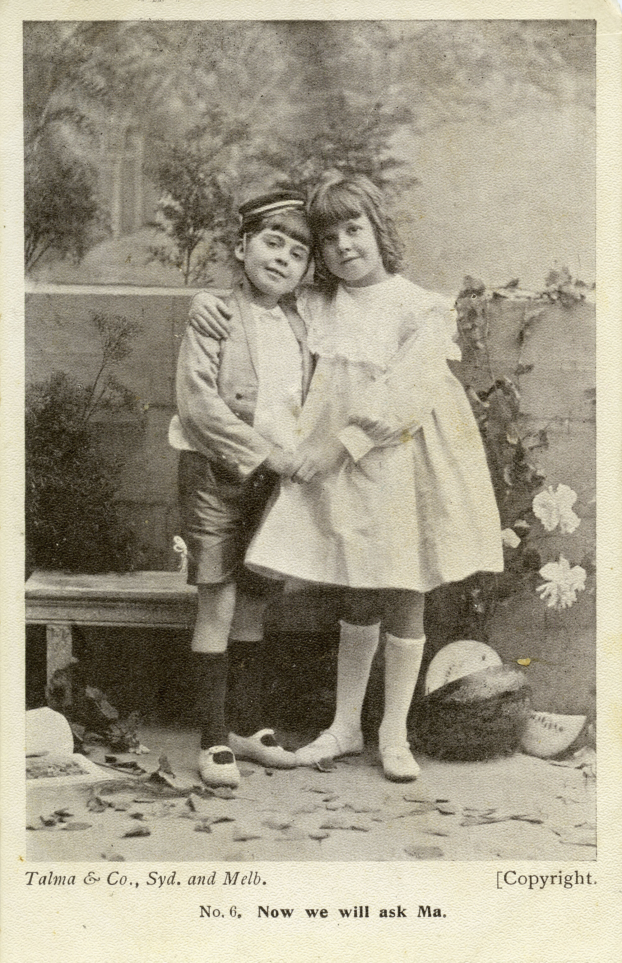 Postcard of a boy and girl embracing. Caption: No. 6 Now we will ask Ma