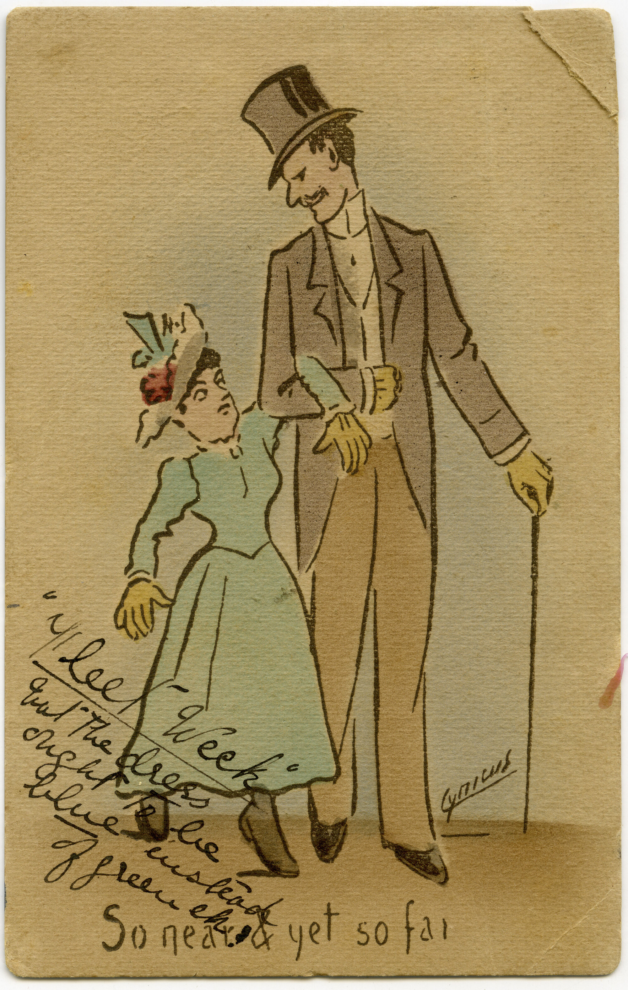 Humorous postcard of a very tall man and a very short woman arm in arm with little success. Caption: So near and yet so far