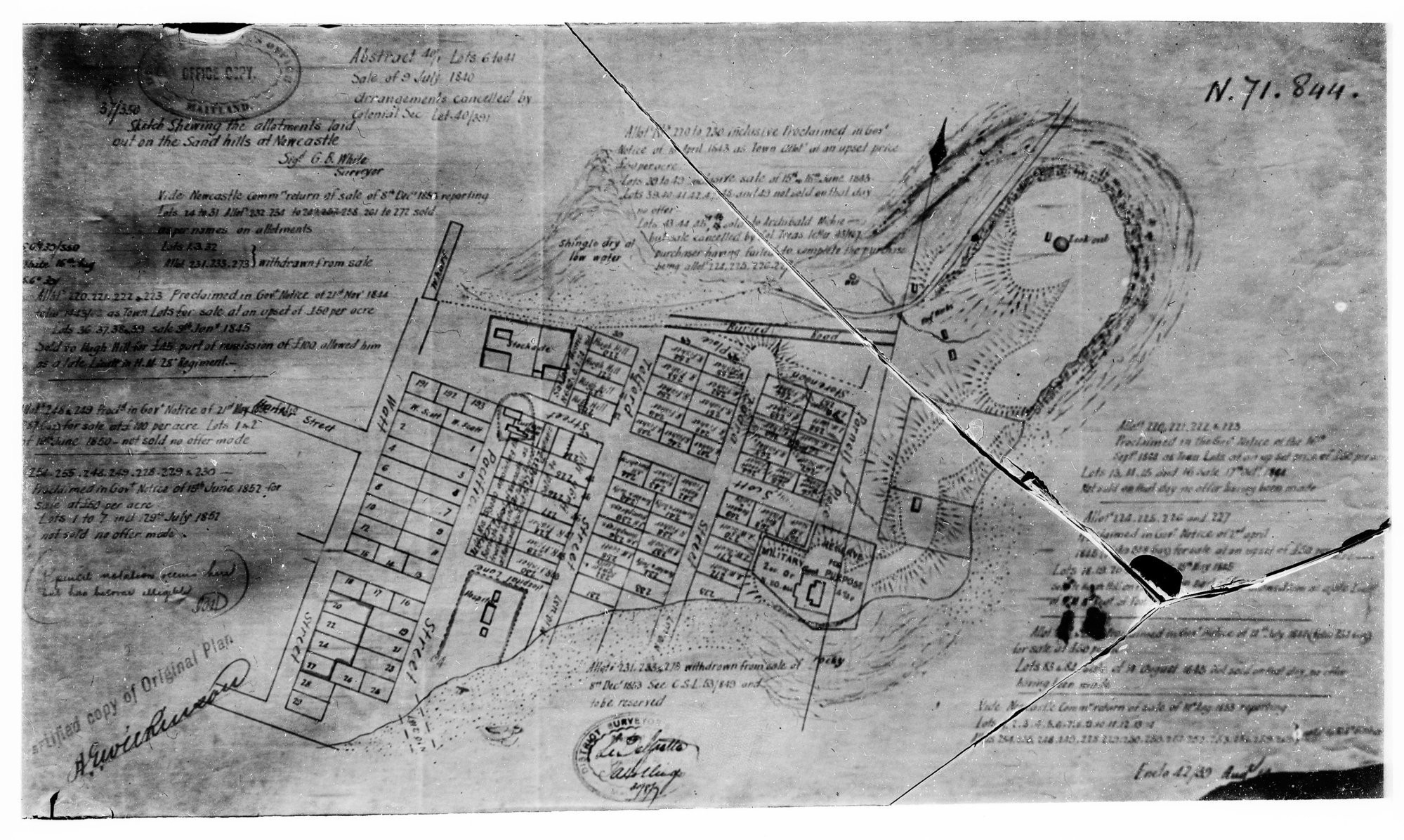 Sketch Showing the allotments laid out on the Sand hills at Newcastle, Signed G.B. White Surveyor [1840-1857]