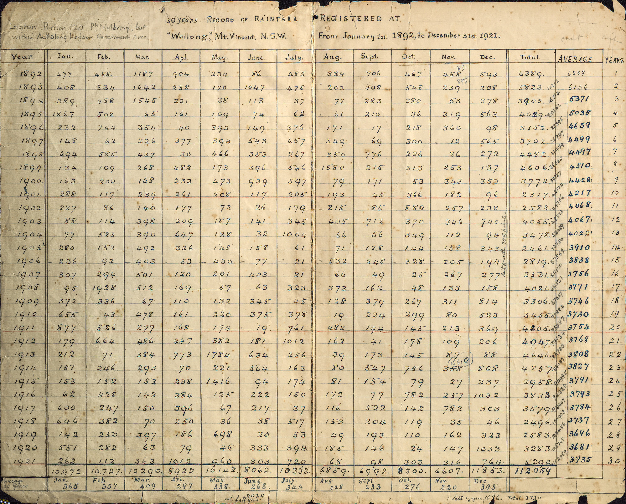Record of Rainfall Registered at "Wollong", Mt. Vincent, NSW, 1892-1948