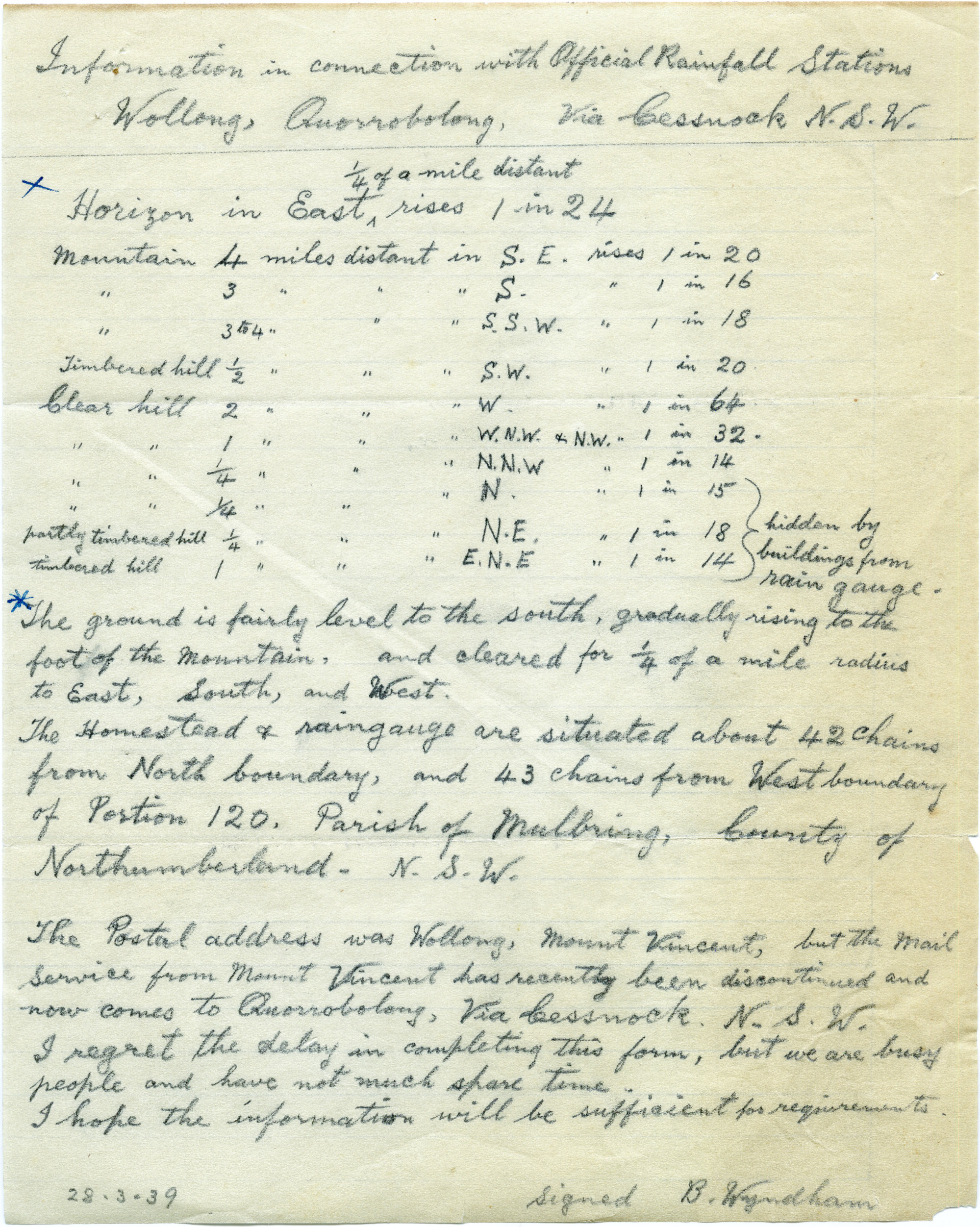 B. Wyndham, Information in connection with Official Rainfall Stations Wollong, Quorrobolong, via Cessnock N.S.W. 28 March 1939 (28th March 1939), [Box 1 Item 6]. Living Histories, accessed 04/04/2026, https://livinghistories.newcastle.edu.au/nodes/view/112762