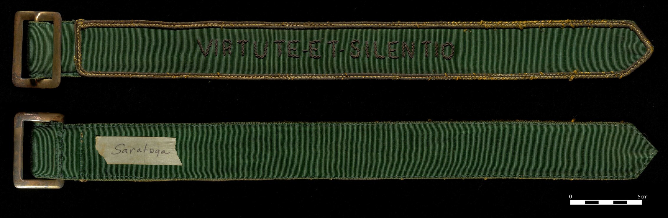 Green strap embroidered with Virtute-et-silentio, [BJFSM0609 ]. Living Histories, accessed 04/04/2026, https://livinghistories.newcastle.edu.au/nodes/view/112883