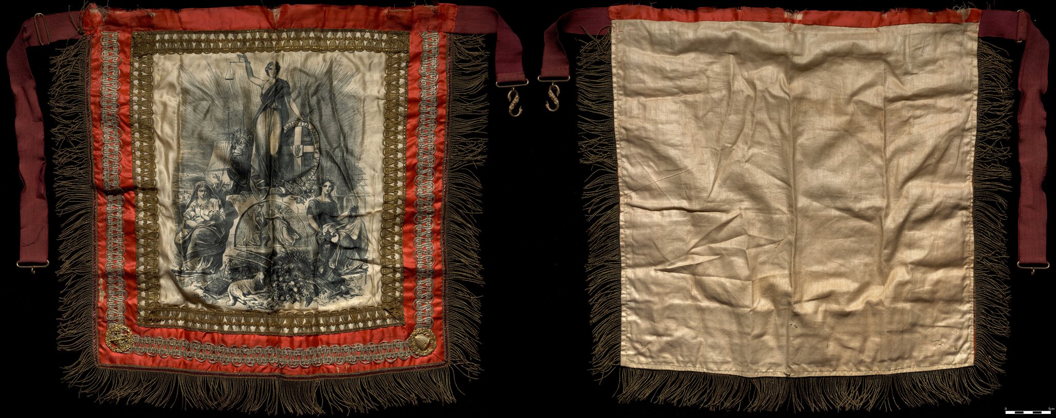 G Tutill, London, Apron, GUOOF, red and gold detail, [BJFSM0948]. Living Histories, accessed 02/04/2026, https://livinghistories.newcastle.edu.au/nodes/view/112985