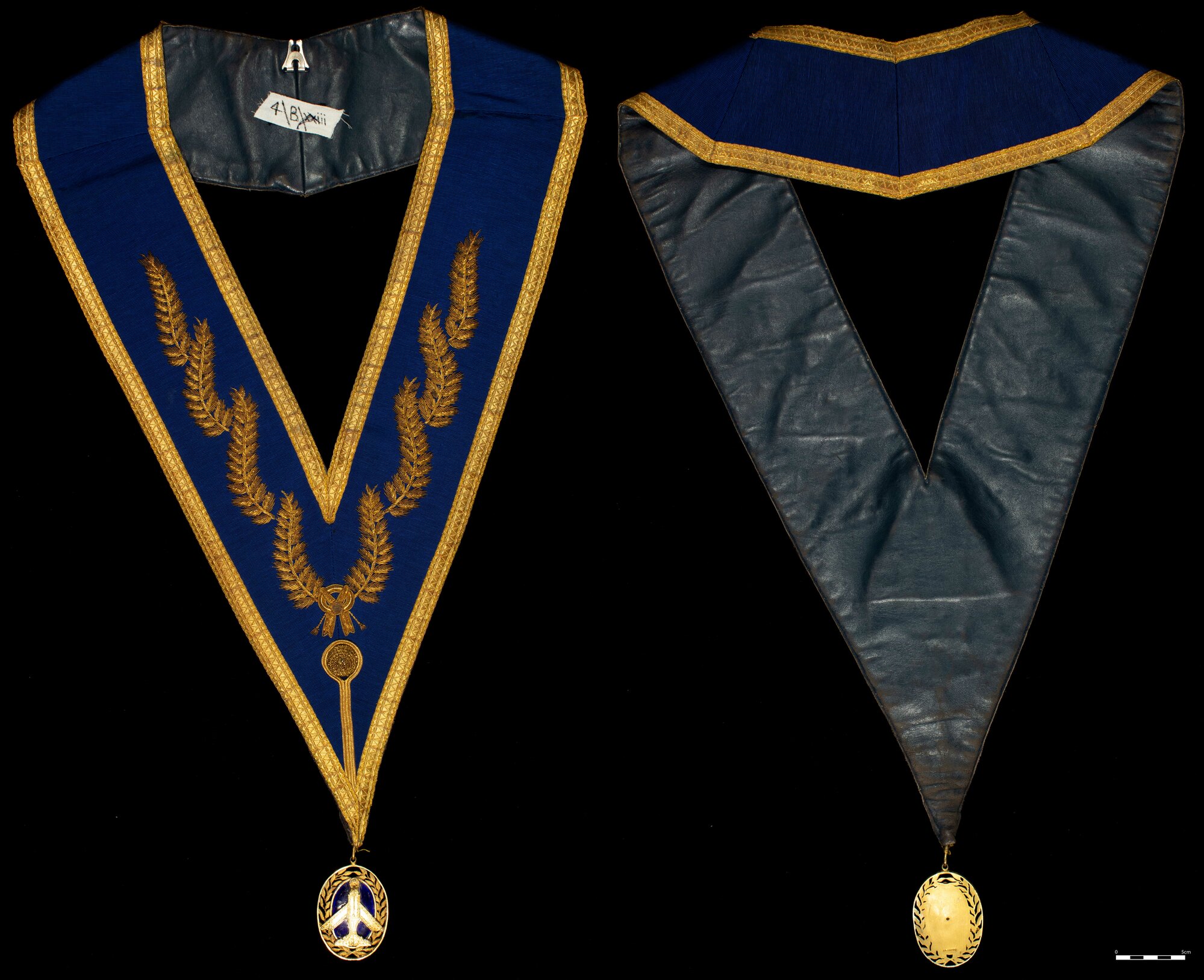 Collar, [Order of the Eastern Star], blue with gold detail, and gold compass , [BJFSM0619]. Living Histories, accessed 04/04/2026, https://livinghistories.newcastle.edu.au/nodes/view/113093