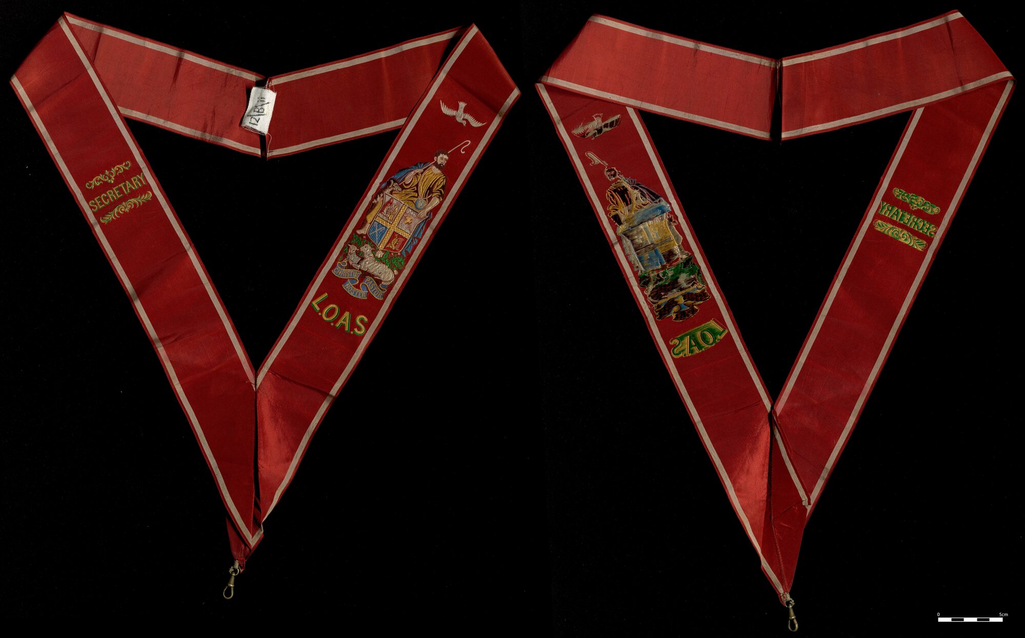 Red collar, Loyal Order of Ancient Shepherds, Secretary, [BJFSM1042]. Living Histories, accessed 04/04/2026, https://livinghistories.newcastle.edu.au/nodes/view/113290