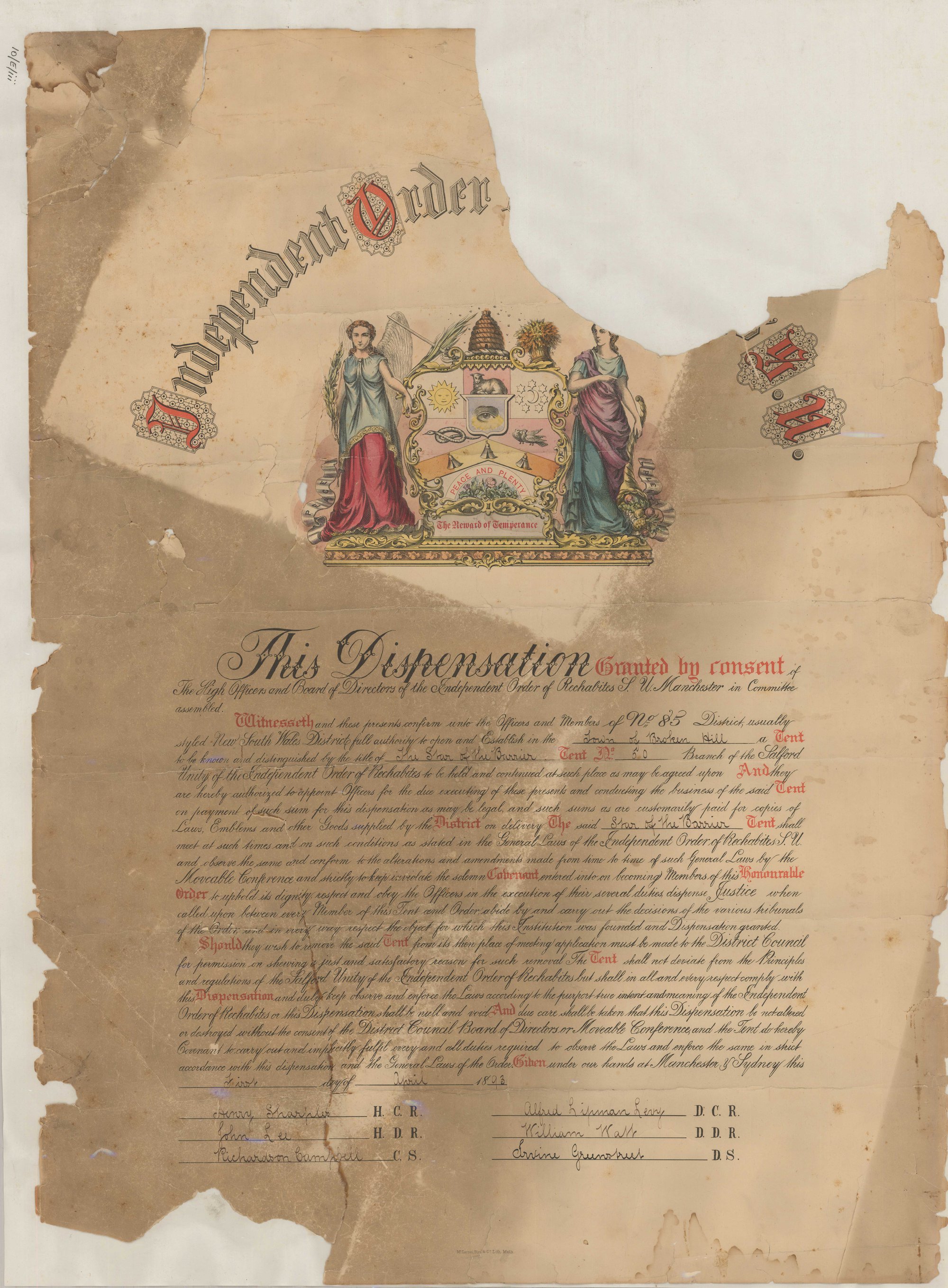 McCarron, Bird and Co. Lith. Melbourne, Dispensation, Indep O of Rechabites, S U, Star of the Barrier Tent No. 50, Broken Hill, NSW, 1893 (1st April 1893), [BJFSM0023]. Living Histories, accessed 17/04/2026, https://livinghistories.newcastle.edu.au/nodes/view/114088