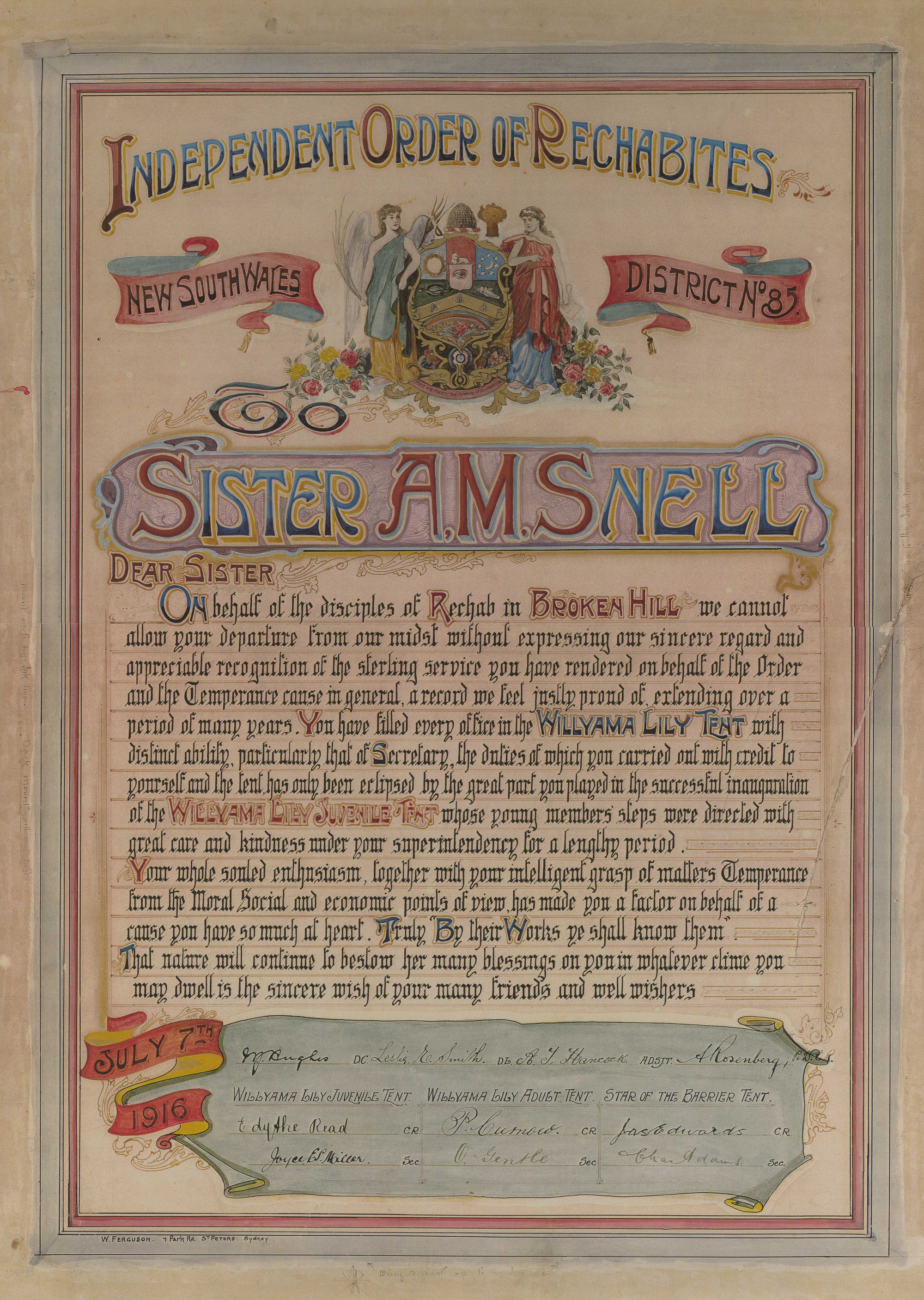 W Ferguson, Sydney, Certificate, Sister A M Snell, Independent Order of Rechabites, Broken Hill, NSW, 1916 (7th July 1916), [BJFSM0040]. Living Histories, accessed 17/04/2026, https://livinghistories.newcastle.edu.au/nodes/view/114105