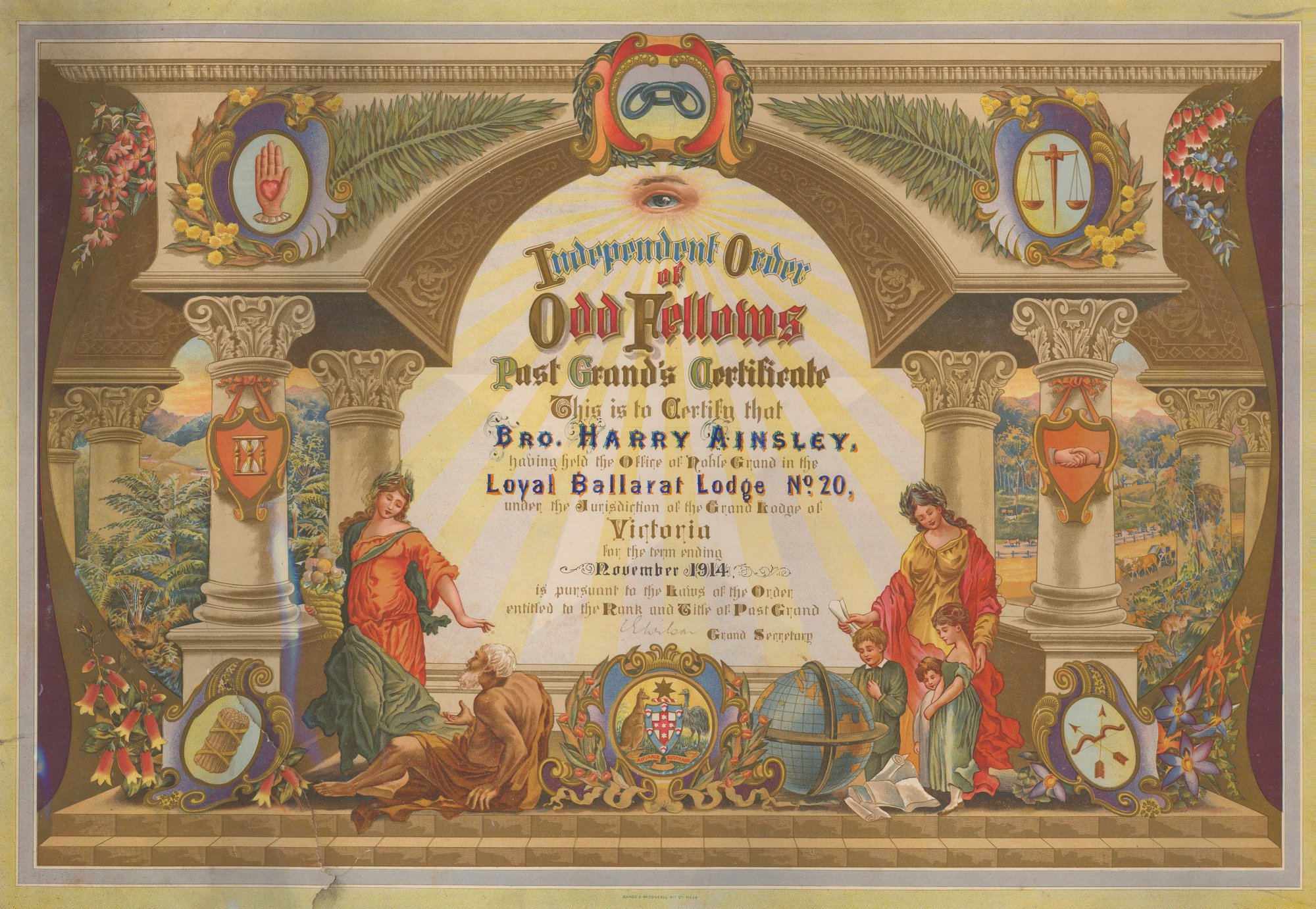 Sands and McDougall Pty. Ltd. Melb., Independent Order of Odd Fellows, Loyal Ballarat Lodge, Harry Ainsley, 1914, [BJFSM0041]. Living Histories, accessed 05/04/2026, https://livinghistories.newcastle.edu.au/nodes/view/114106