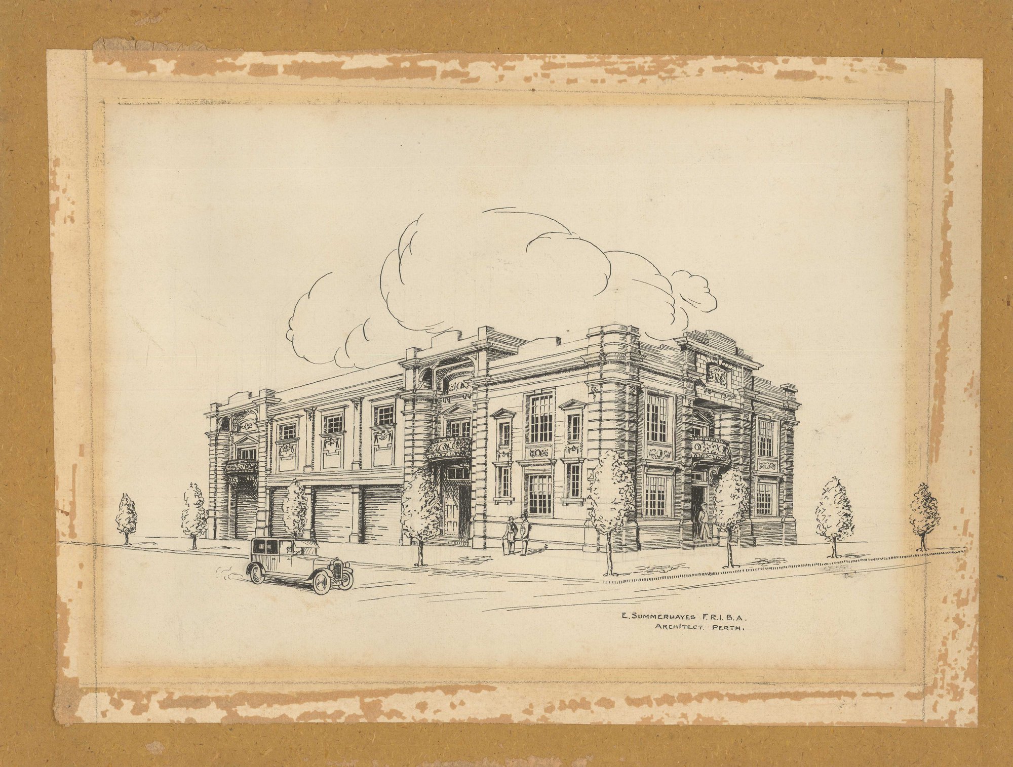 E. Summerhayes F.R.I.B.A. Architect, Perth, Architectural sketch by Edwin Summerhayes, Ancient Order of Foresters building, Perth, [1920s], [BJFSM0052]. Living Histories, accessed 04/04/2026, https://livinghistories.newcastle.edu.au/nodes/view/114115