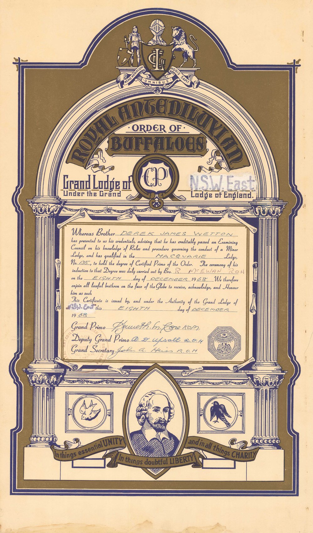 Certificate, Derek James Wetton, Macquarie Lodge, R.O.A.B., NSW, 1968