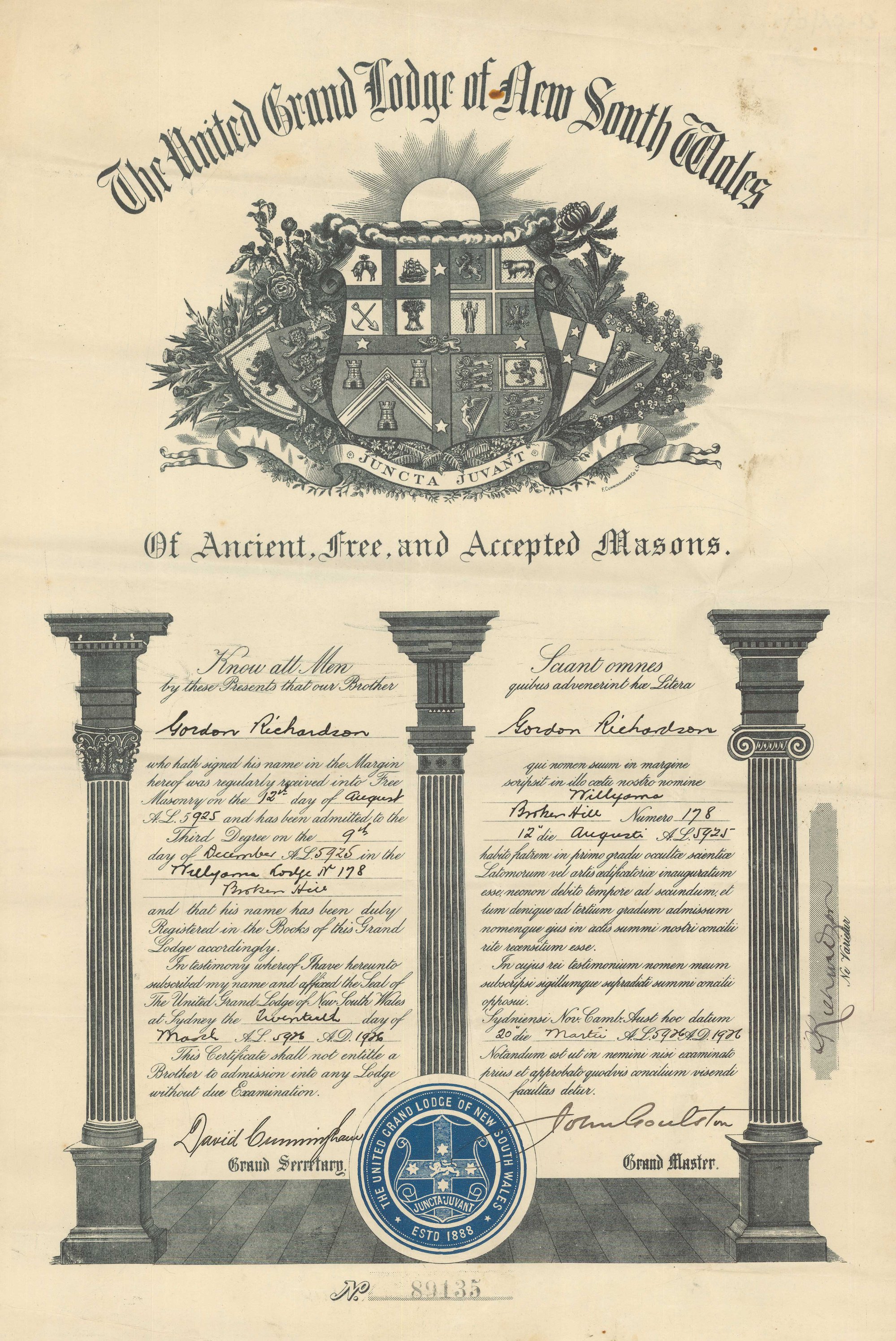 F Cunningham and Co. Ltd., Certificate, Gordon Richardson, United Grand Lodge of Ancient, Free and Accepted Masons, 1926 (20th March 1926), [BJFSM0072]. Living Histories, accessed 17/04/2026, https://livinghistories.newcastle.edu.au/nodes/view/114135
