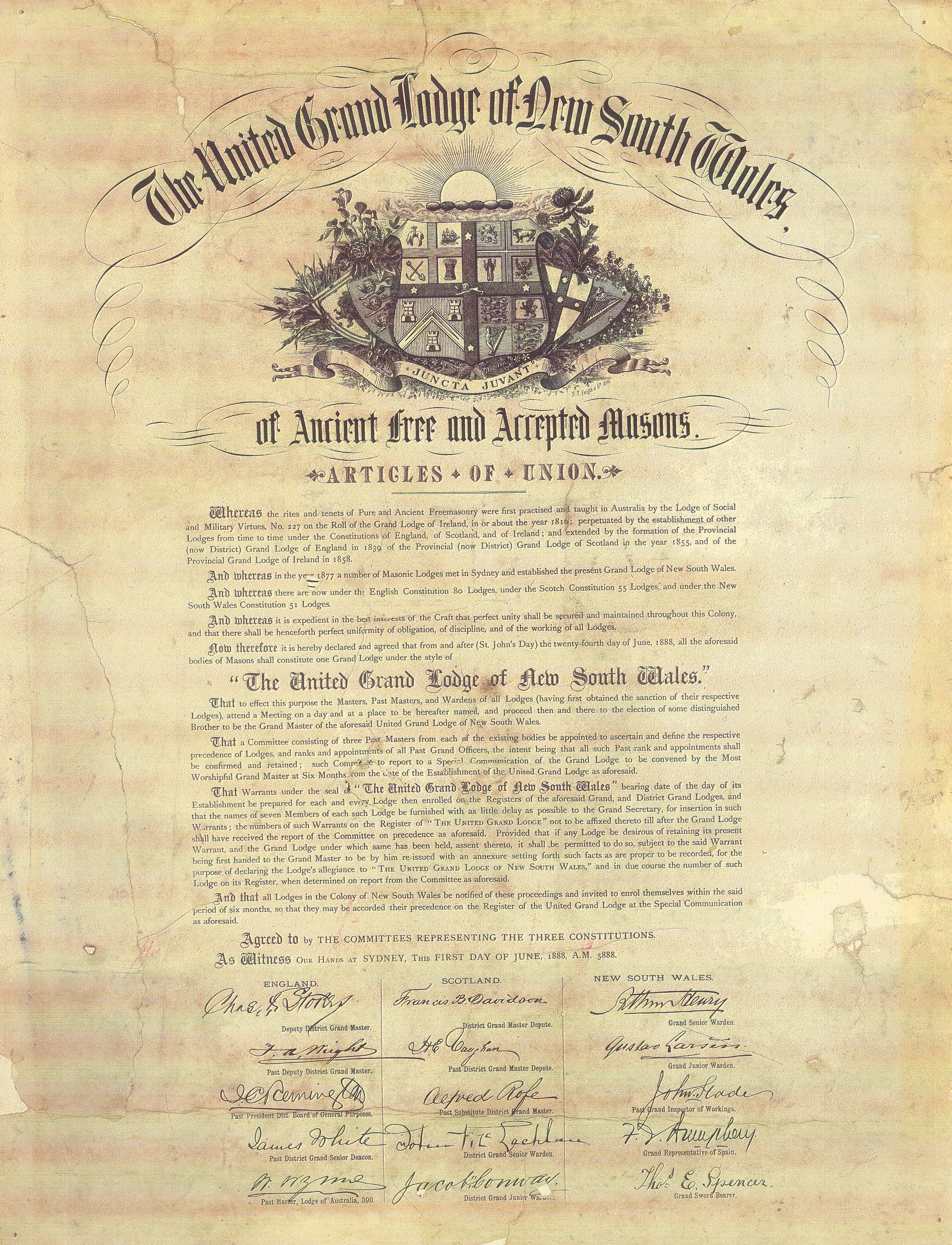 The United Grand Lodge of NSW, Articles of Union, 1888 (1st June 1888), [BJFSM0084]. Living Histories, accessed 03/04/2026, https://livinghistories.newcastle.edu.au/nodes/view/114147