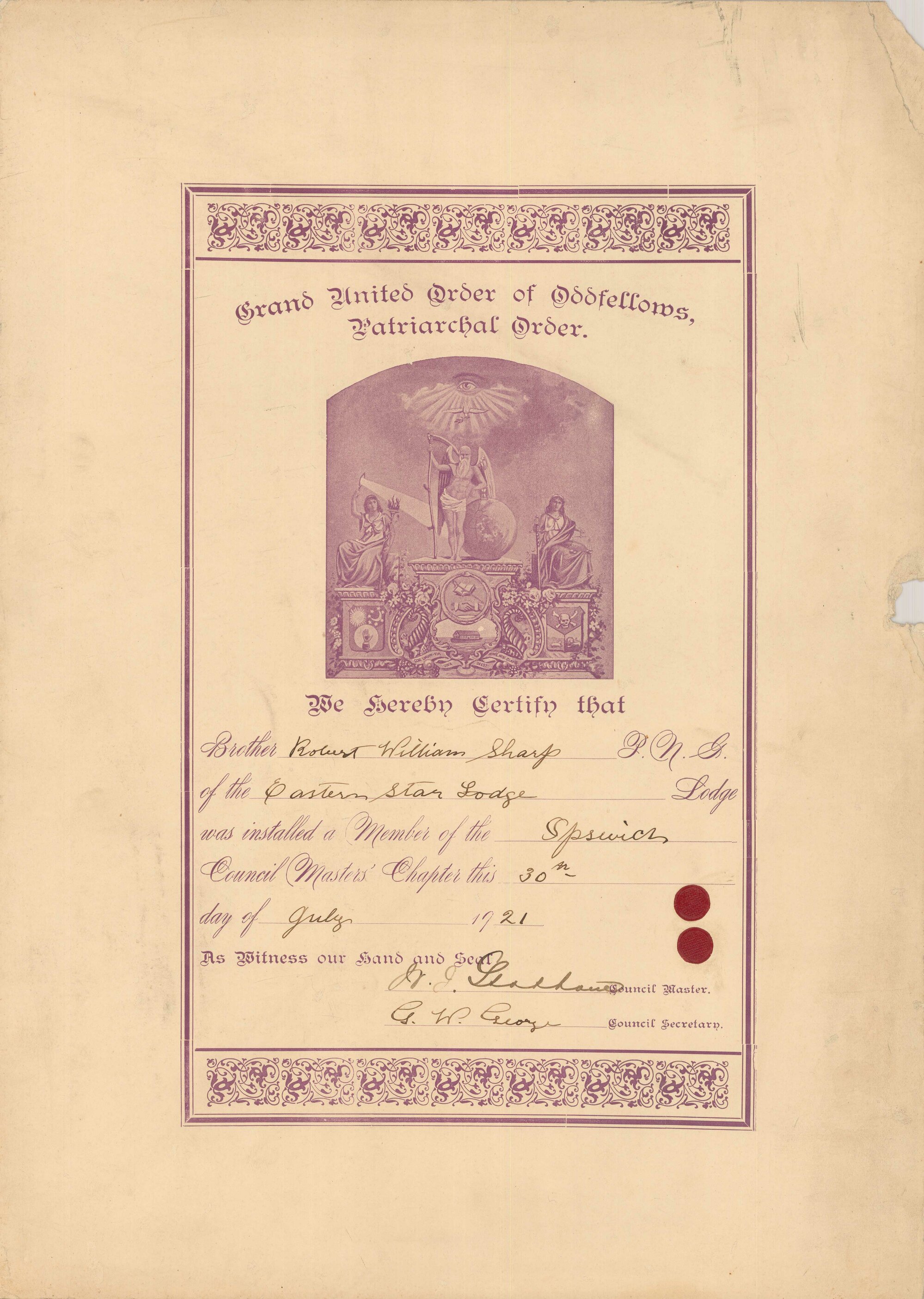G.U.O.O.F. Patriarchal Order, Robert William Sharp, Eastern Star Lodge, 1921 (30th July 1921), [BJFSM0094]. Living Histories, accessed 17/04/2026, https://livinghistories.newcastle.edu.au/nodes/view/114157