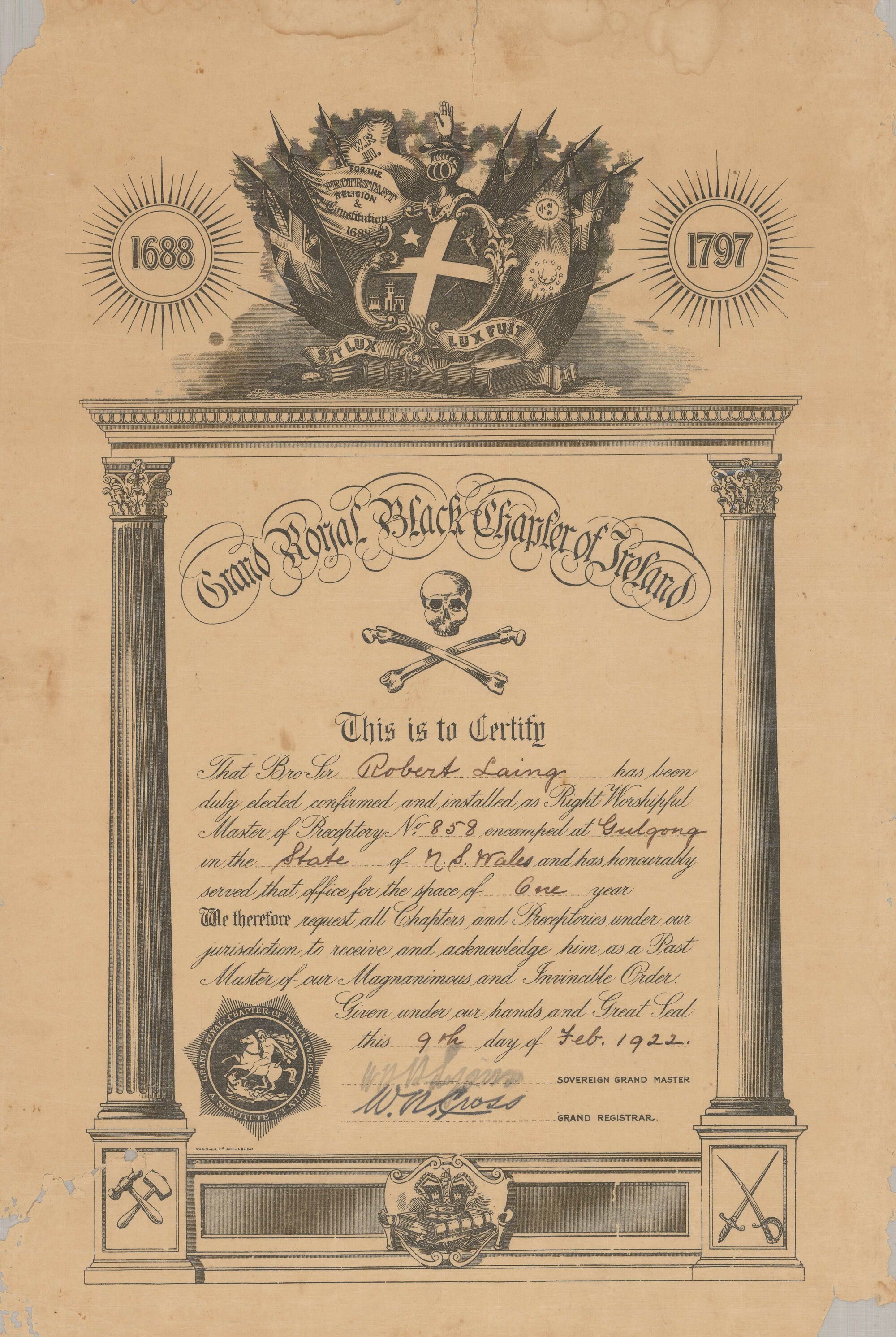 W and G Baird Ltd., Dublin and Belfast, Robert Laing Grand Royal Black Chapter of Ireland, 1922 (2nd September 1922), [BJFSM0097]. Living Histories, accessed 04/04/2026, https://livinghistories.newcastle.edu.au/nodes/view/114160