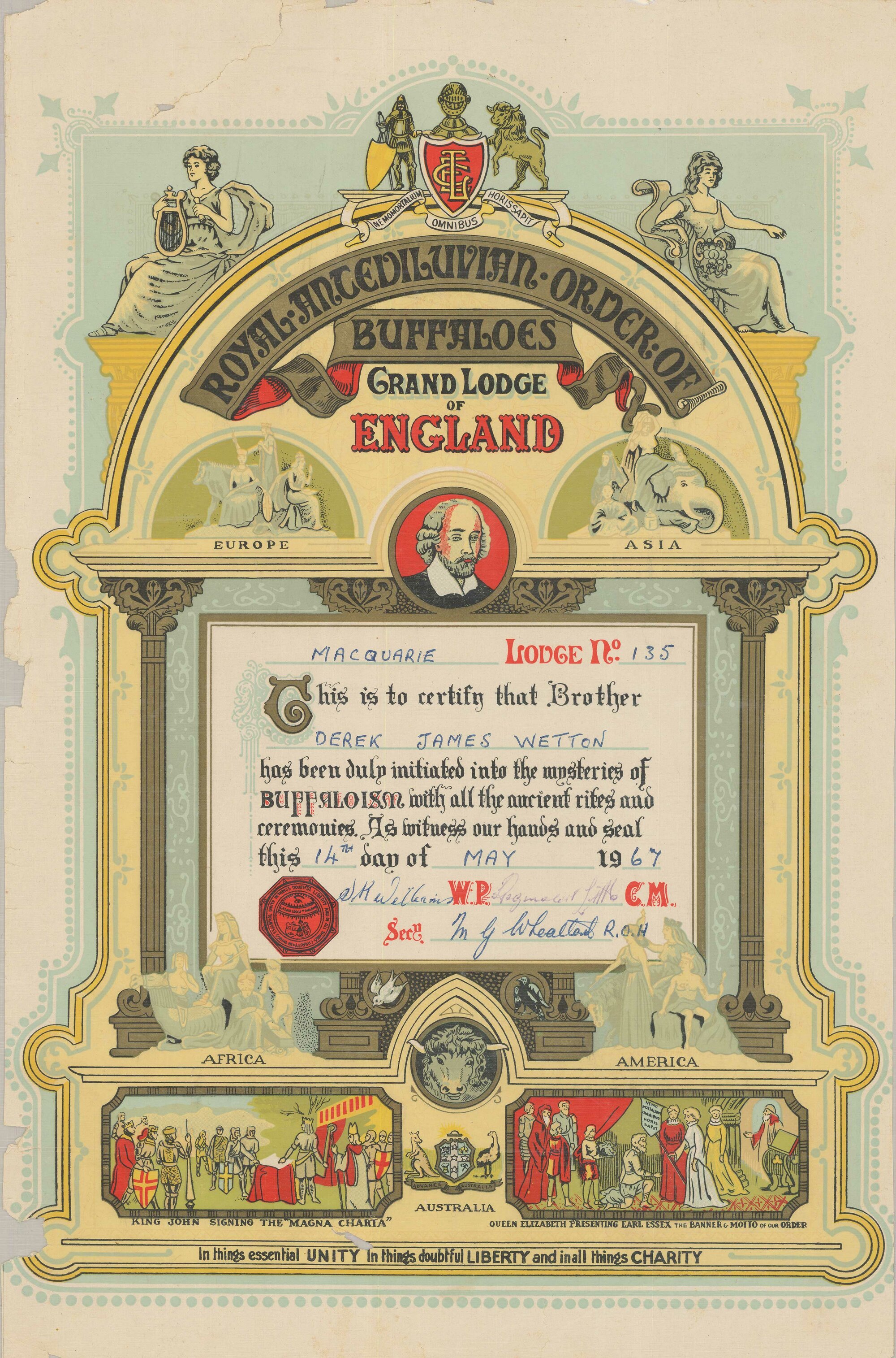 Royal Antediluvian Order of Buffaloes, Macquarie Lodge, Derek James Wetton, 1967 (14th May 1967), [BJFSM0101]. Living Histories, accessed 04/04/2026, https://livinghistories.newcastle.edu.au/nodes/view/114164