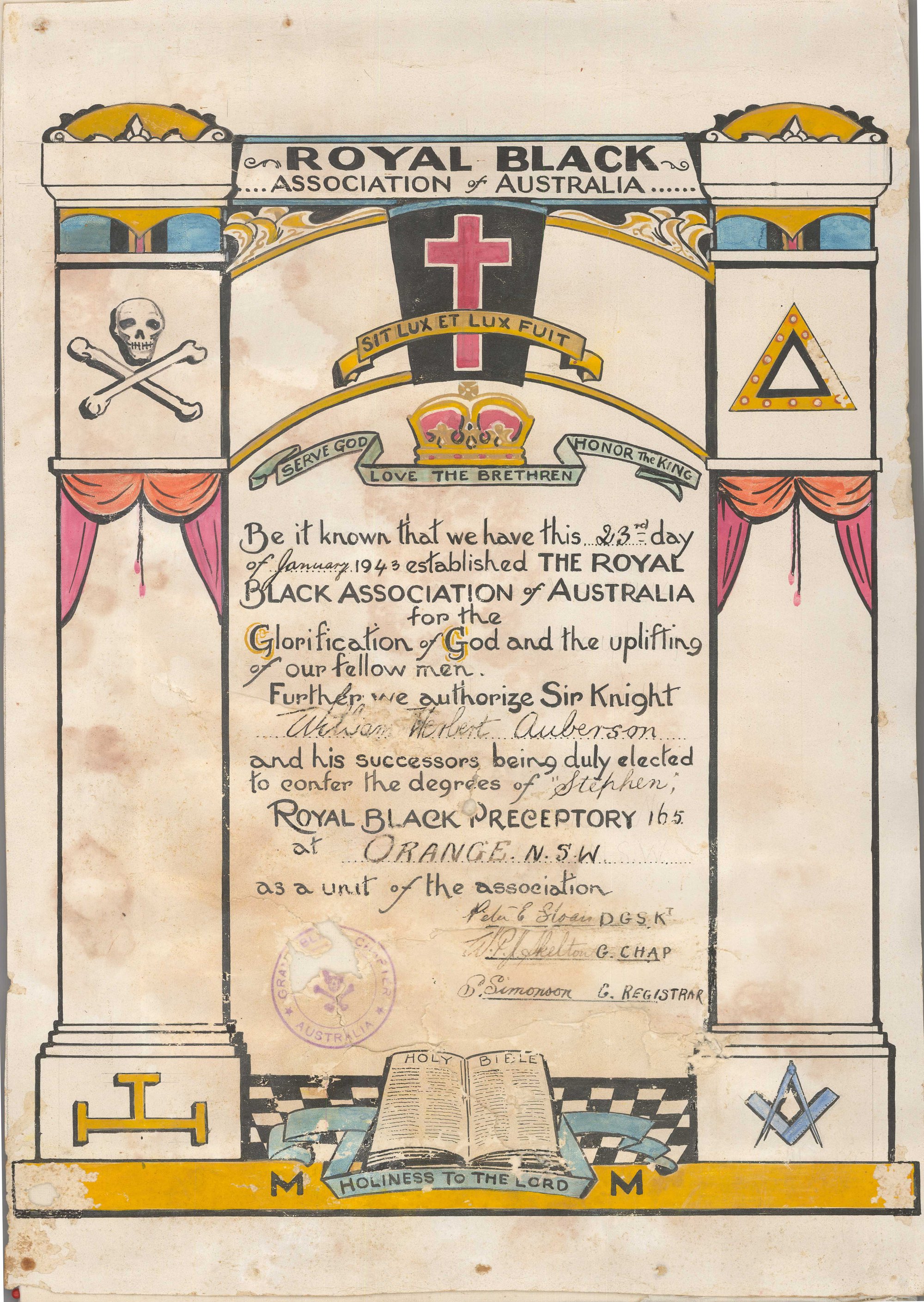 Royal Black Association of Australia, Orange, NSW, 1943 (23rd January 1943), [BJFSM0162]. Living Histories, accessed 04/04/2026, https://livinghistories.newcastle.edu.au/nodes/view/114228