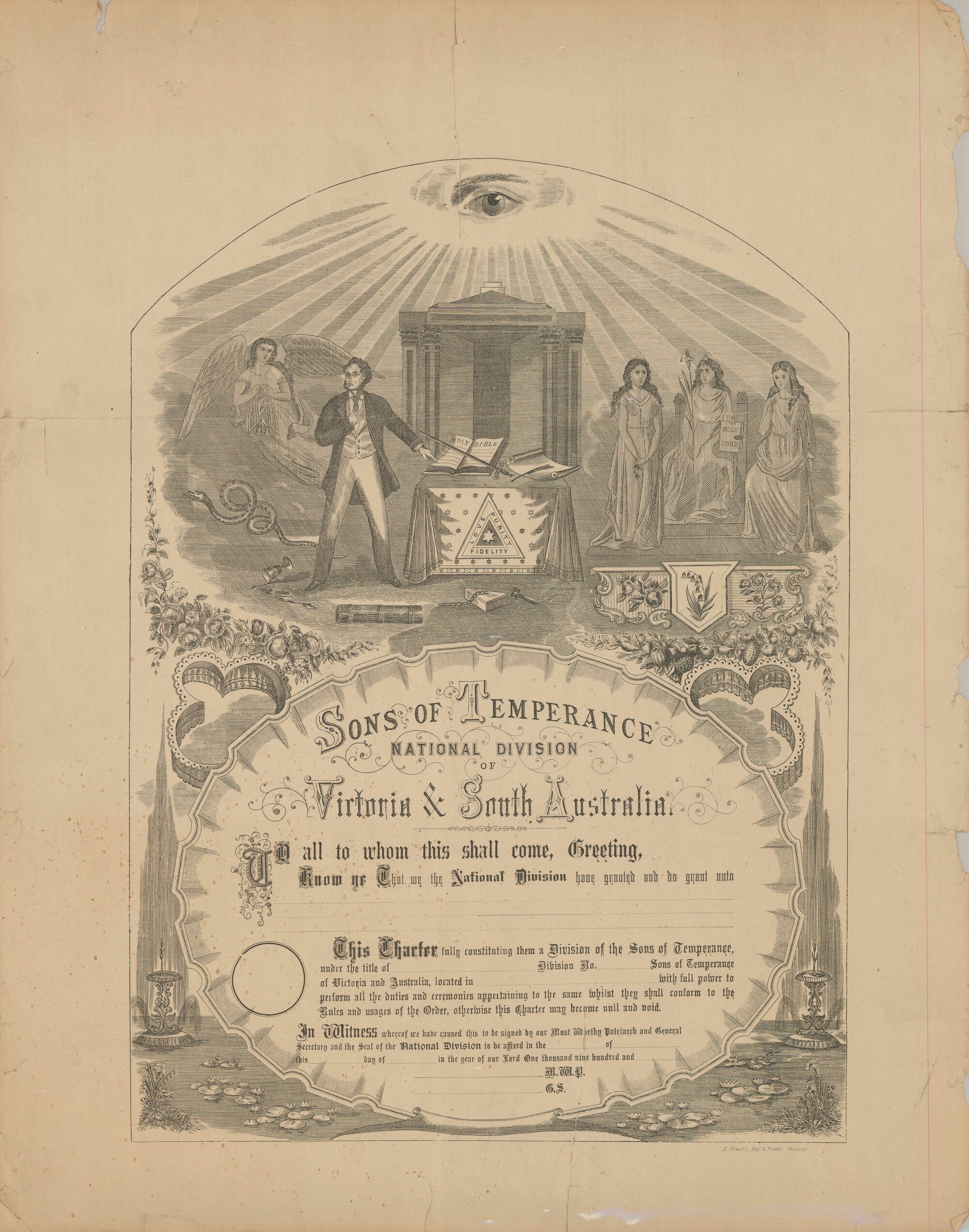 H Franks, Engr. and Printer, Geelong, Charter, Sons of Temperance National Division of Victoria and South Australia, [BJFSM0235]. Living Histories, accessed 15/04/2026, https://livinghistories.newcastle.edu.au/nodes/view/114299
