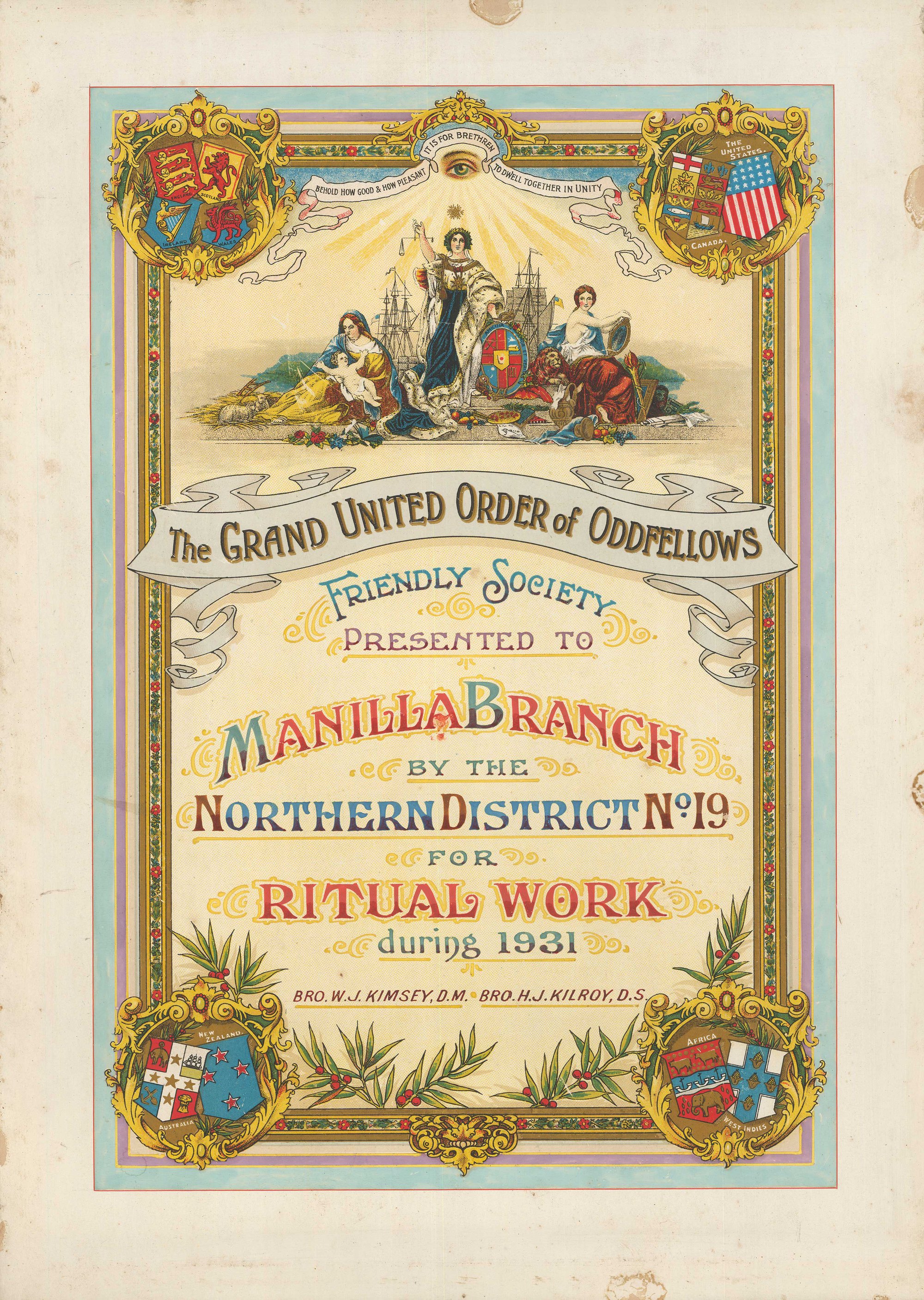 Certificate, Manilla Branch, G.U.O.O.F., for ritual work, 1931