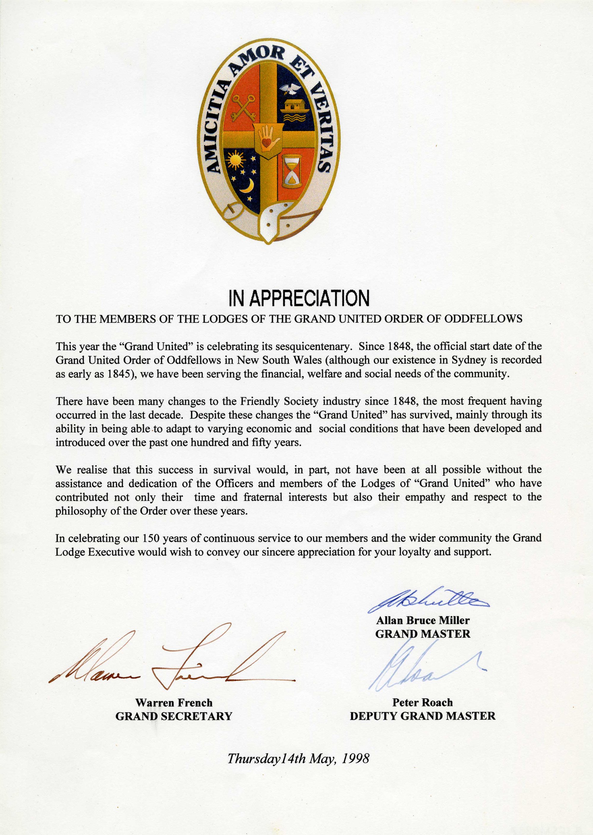 Warren French, Allan Bruce Miller, Peter Roach, Letter of appreciation to the members of the lodges of the Grand United Order of Oddfellows, 1998 (14th May 1998), [BJFSM0287]. Living Histories, accessed 17/04/2026, https://livinghistories.newcastle.edu.au/nodes/view/114351