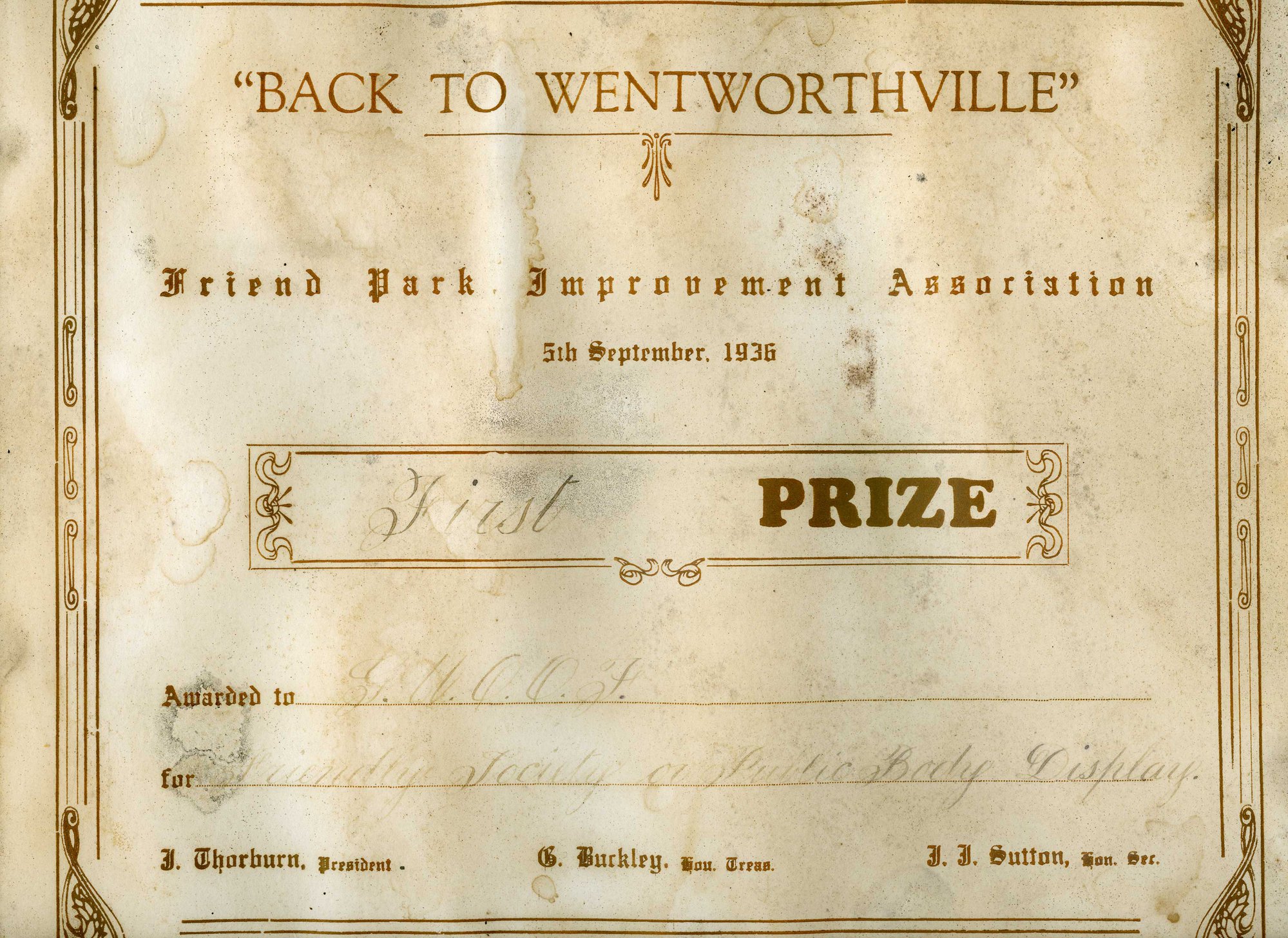 Award, "Back to Wentworthville" Friend Park Improvement Association, 1936